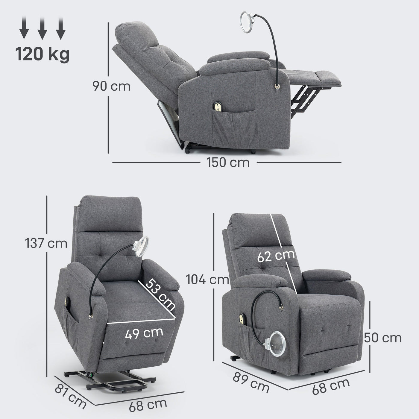 HOMCOM Electric Rise/Recline Armchair, with Reading Light - Grey - Grey