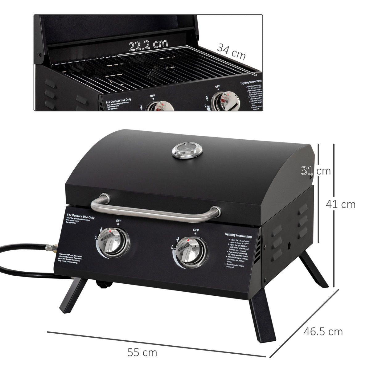 Outsunny 2 Burner Gas BBQ Grill Outdoor Portable Folding Tabletop Barbecue w/ Lid, Thermometer, Carbon Steel, Black - Black