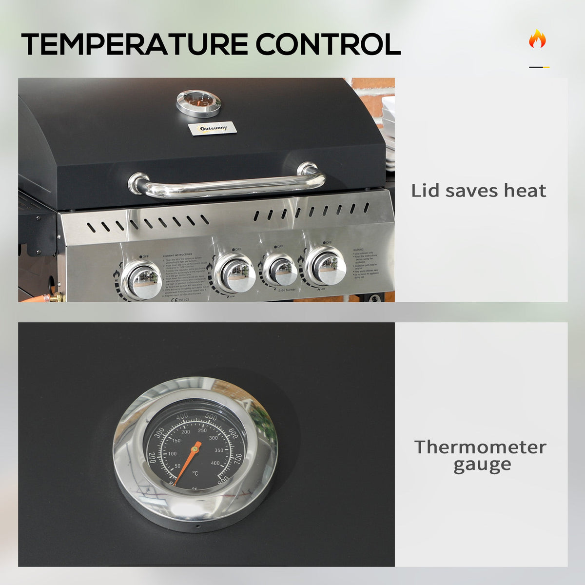 Outsunny Four-Burner Steel Gas Grill, with Thermometer - Black - Black