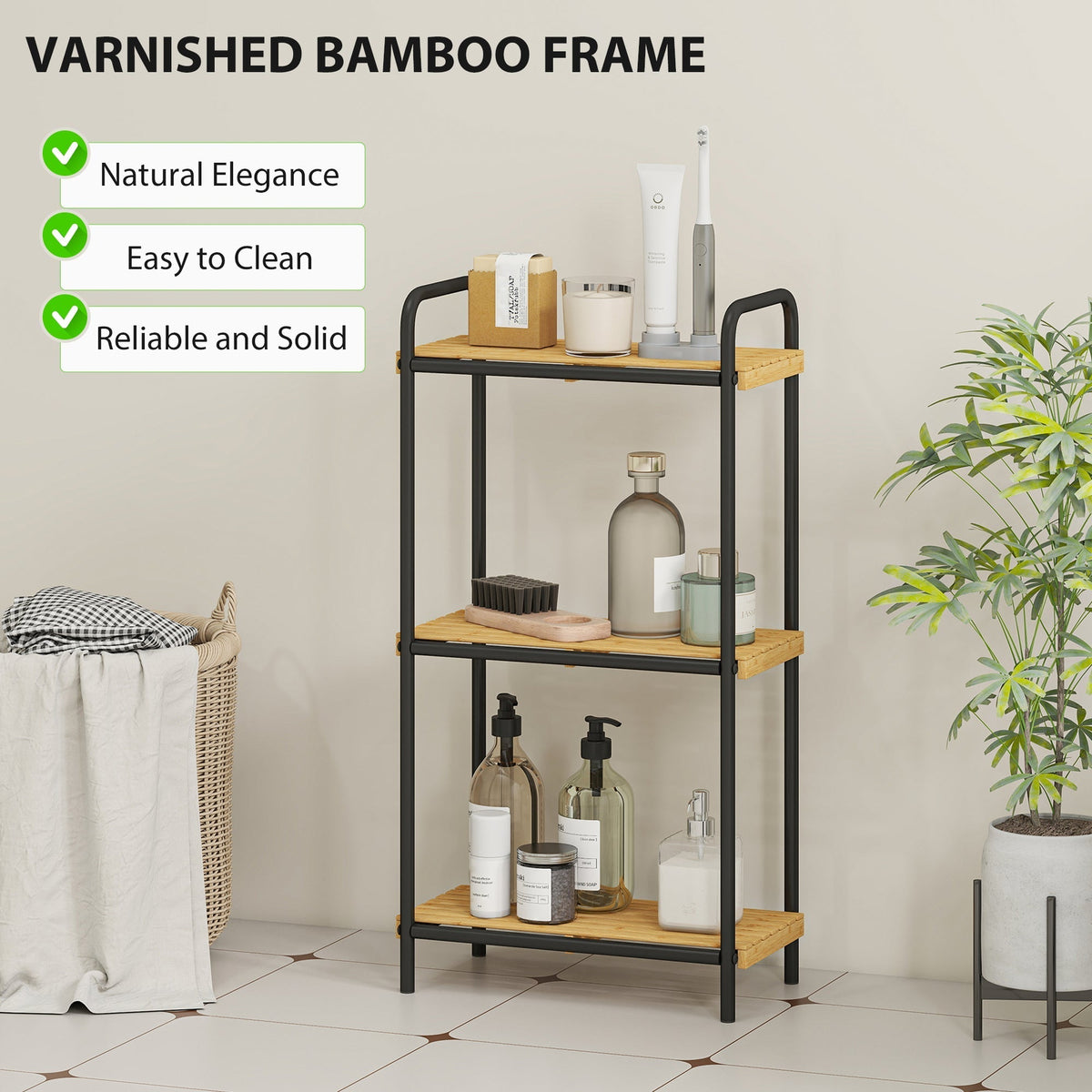 HOMCOM 3-Tier Bamboo Bathroom Storage Shelf, Freestanding Narrow Shelving Unit with Slatted Shelves for Kitchen Bathroom Living Room, 41.5 x 21.5 x 77.5 cm, Natural and Black - Black