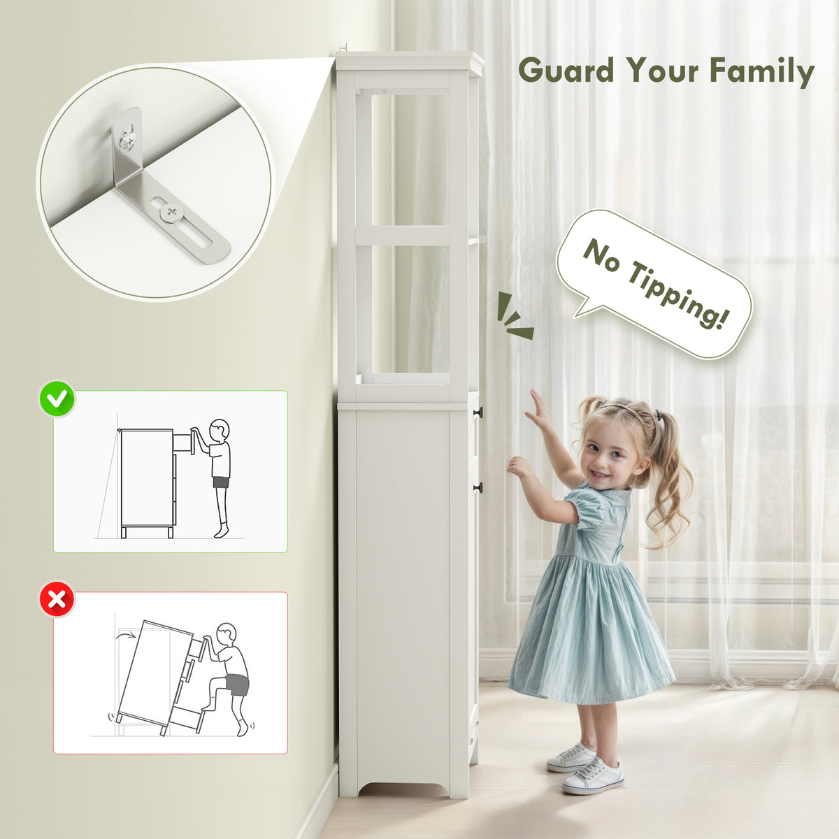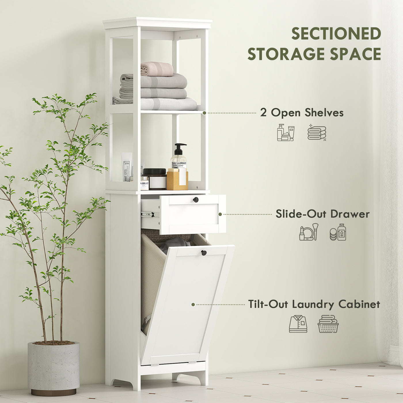 HOMCOM Tall Bathroom Cabinet, with Laundry Basket - White - White