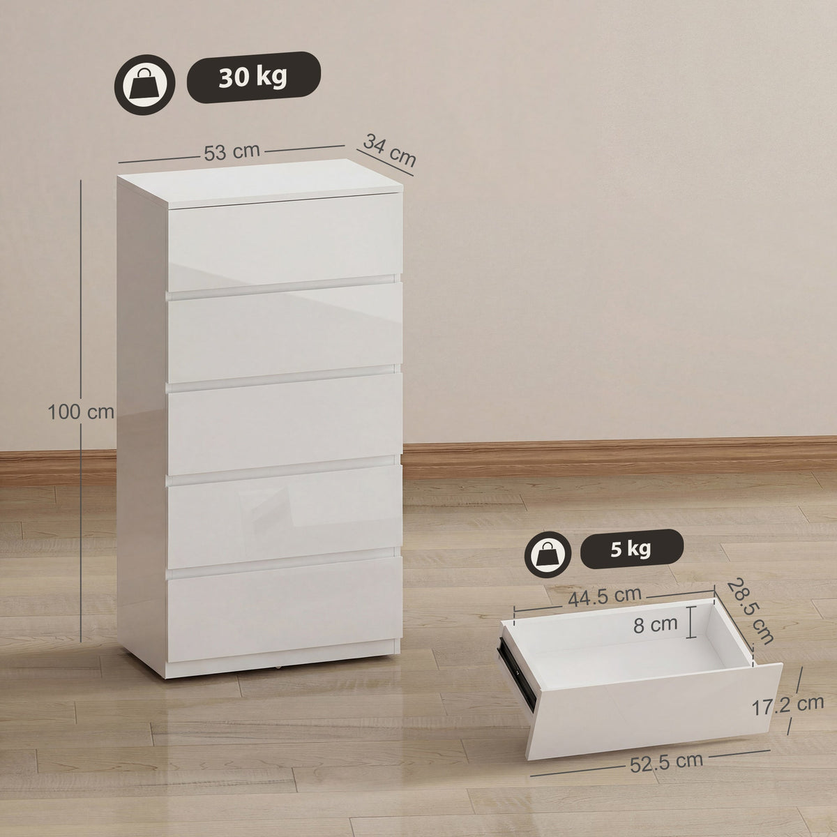 HOMCOM Chest of Drawers, 5-Drawer Storage Cabinets, Modern Dresser, Storage Drawer Unit for Bedroom - High Gloss White
