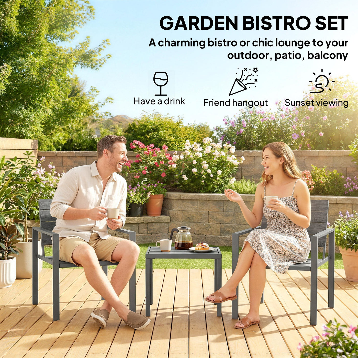 Outsunny 3 Pieces Garden Bistro Set for 2, Outdoor Bistro Table and Chairs with Metal Frame, Plastic Patio Furniture Set - Dark Grey