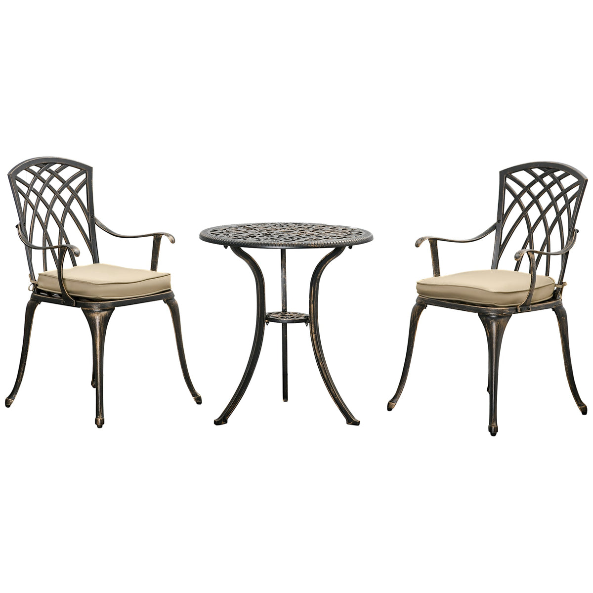 Outsunny 3pc Cast Aluminium Garden Bistro Set for 2 with Parasol Hole, Outdoor Coffee Table Set Rust Resistant with Cushions, Bronze - Bronze Tone