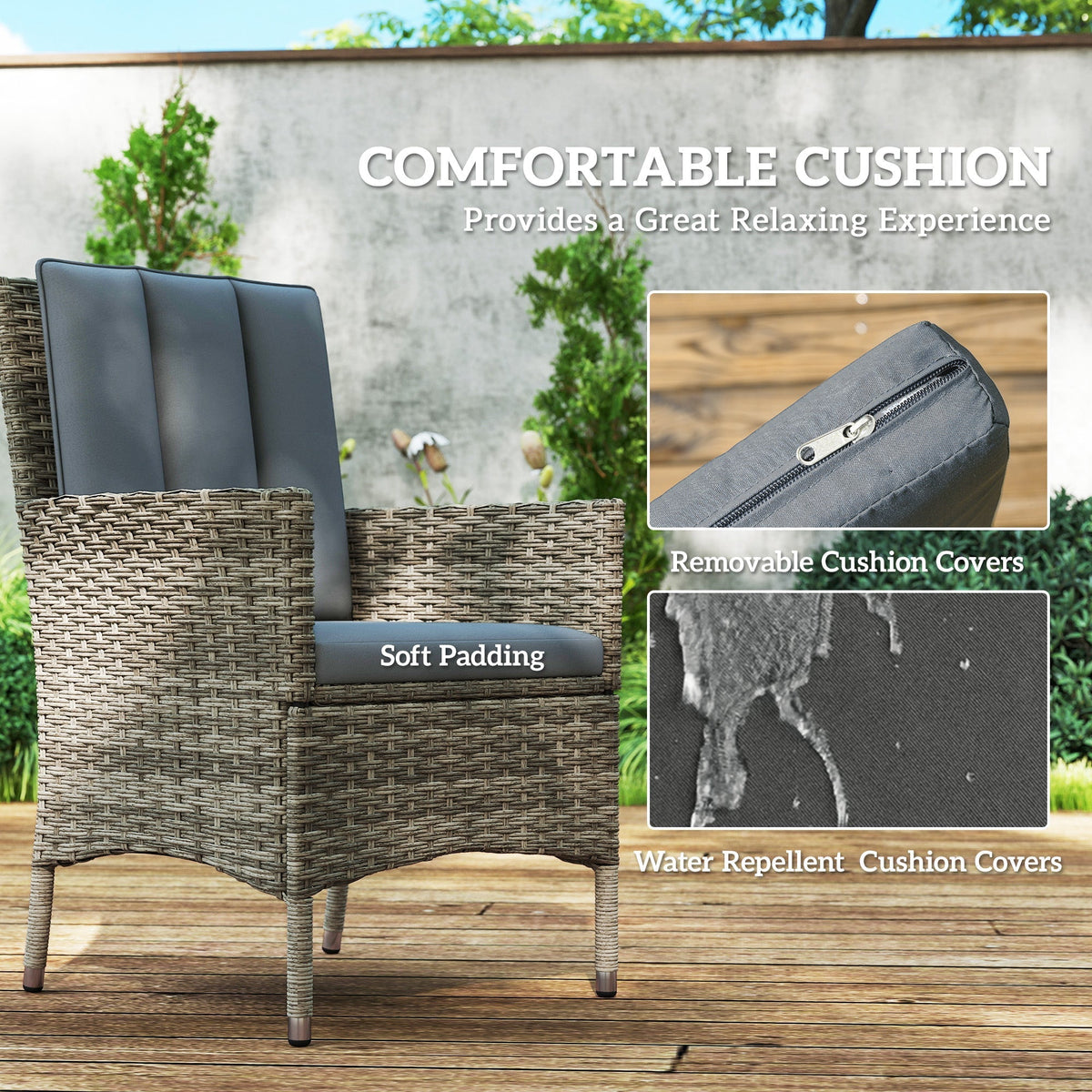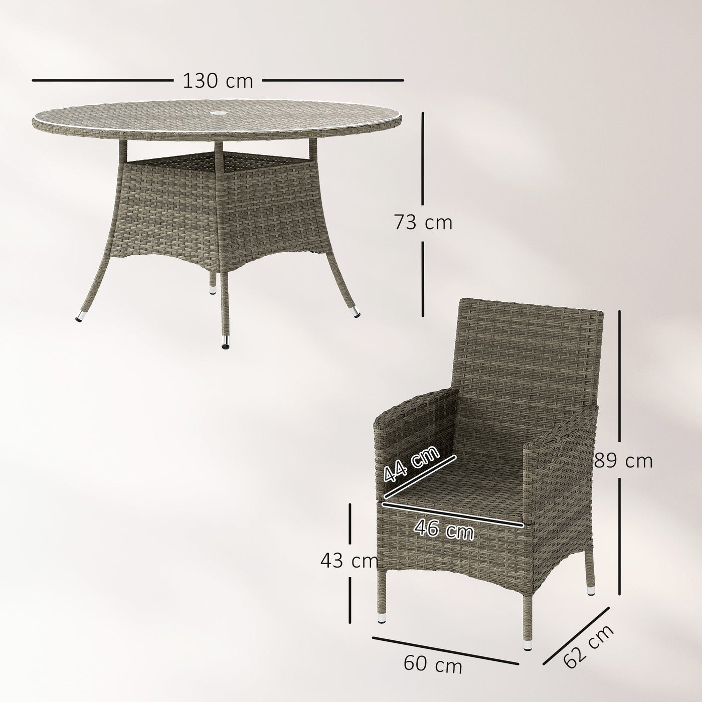 Outsunny Seven-Piece Rattan Dining Table, with Round Glass-Top Table - Light Grey - Light Grey