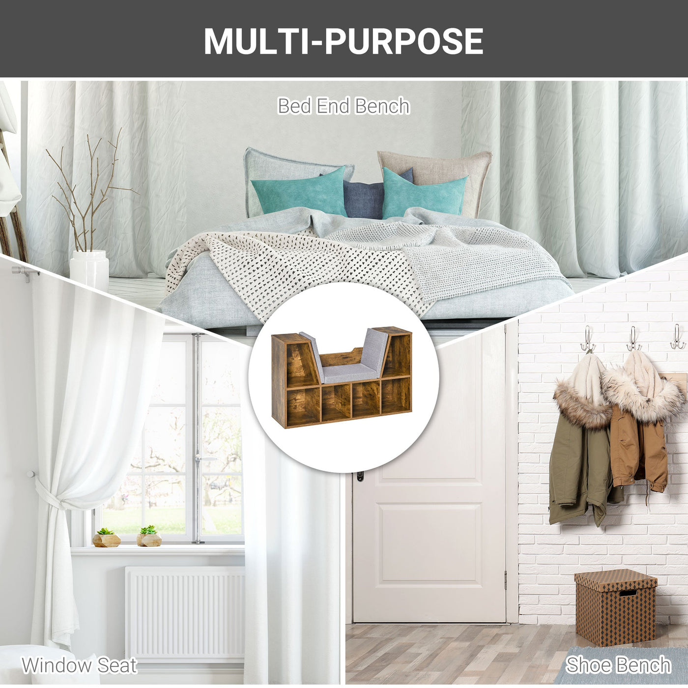 HOMCOM Bookcase Storage Shelf with Cushioned Reading Seat, Cube Bookshelf Organizer for Bedroom Living Room, Rustic Brown - Rustic Brown