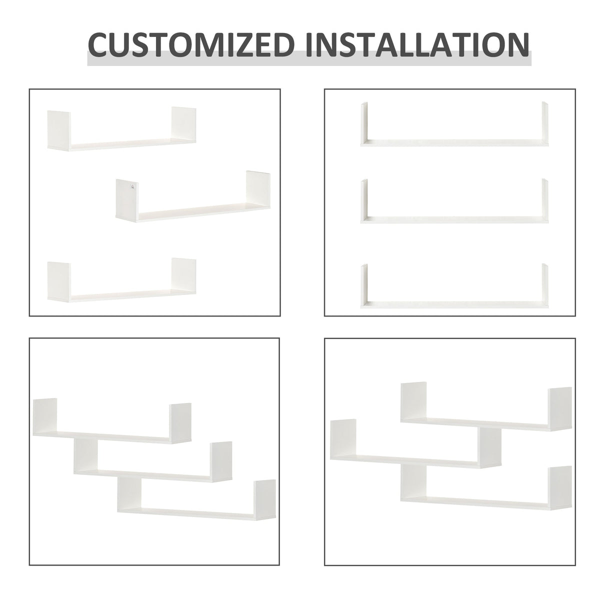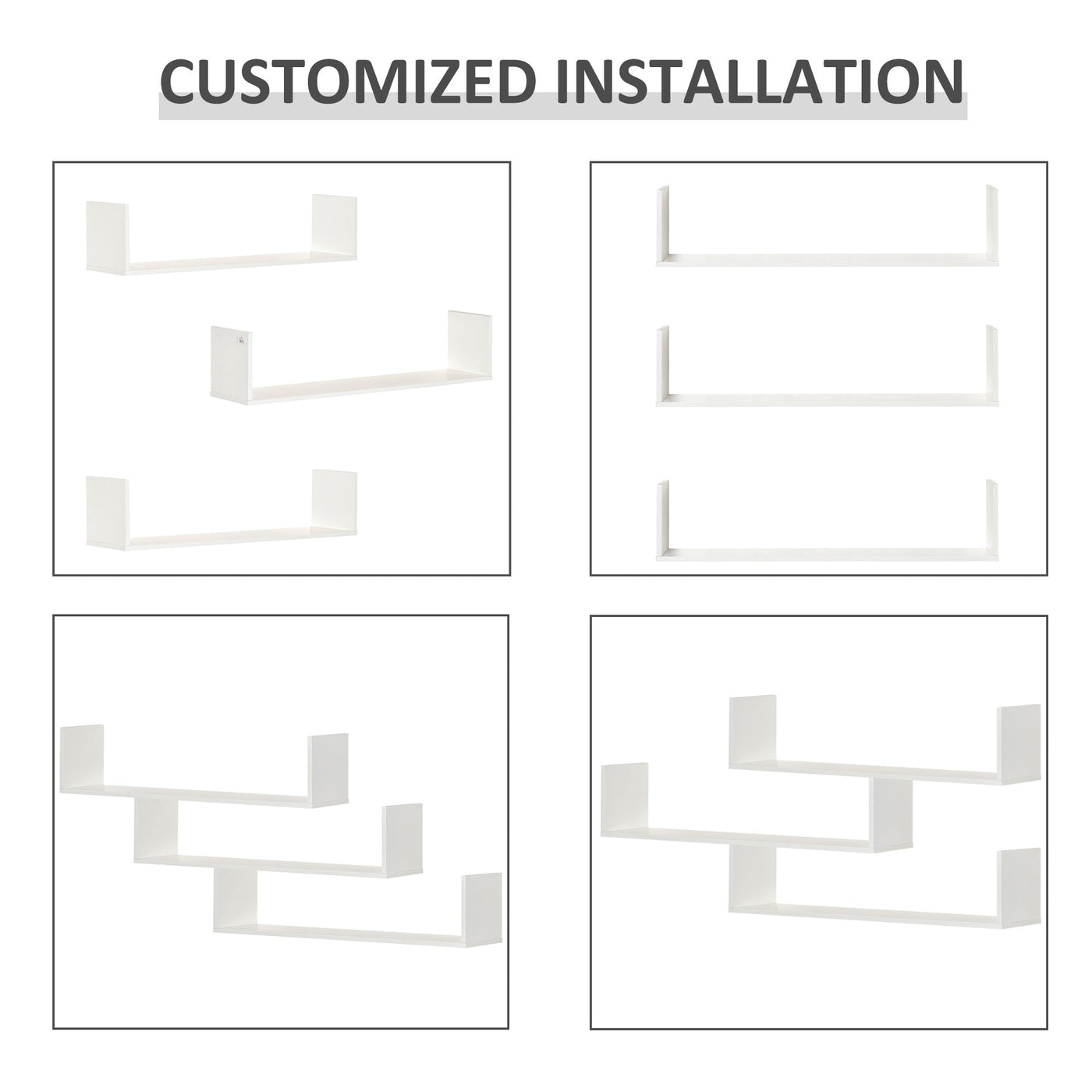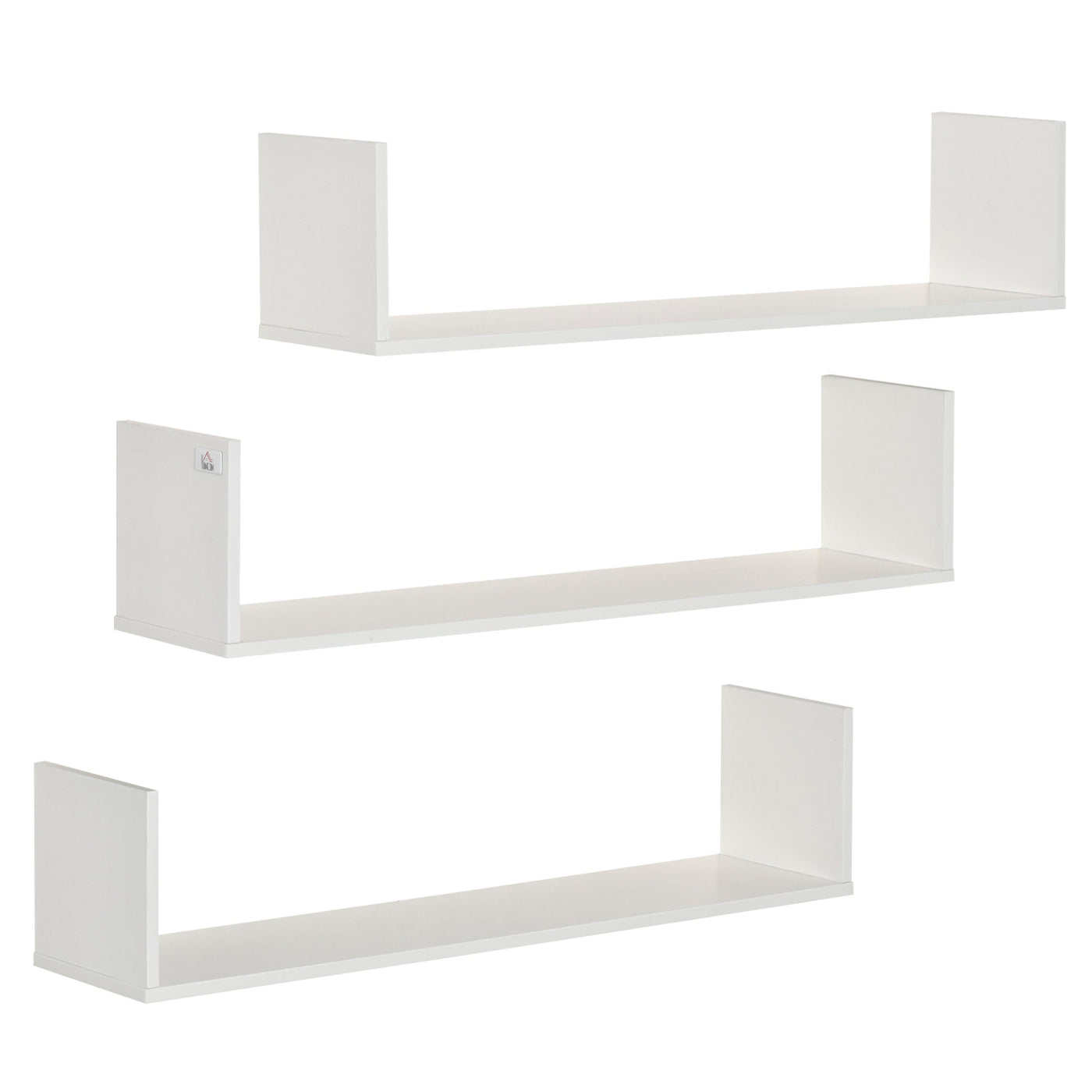 HOMCOM Set of 3 Wooden U-Shaped Floating Shelves Set Wall Mounted Hanging Bookshelf CD DVD Storage Display for Bedroom Living Room Kitchen, White - White