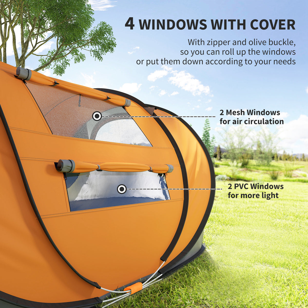 Outsunny 4 Person Pop-up Camping Tent Family Tent with Ground Sheet, 4 Windows and Portable Carry Bag for Beach Outdoor Trip, Orange - Orange