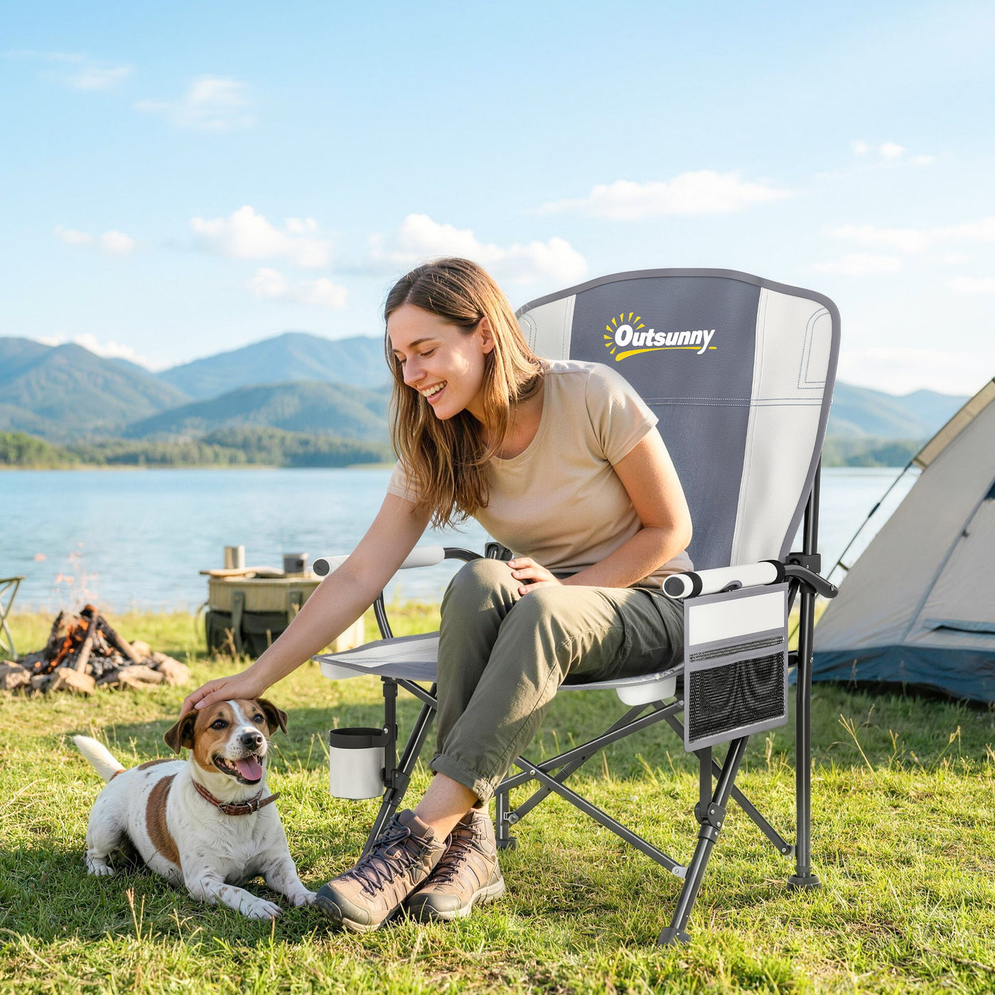 Outsunny Padded Camping Chair Adults Heavy Duty Folding Chair Side Pocket Cup Holder Carry Bag Outdoor Light Grey - Light Grey