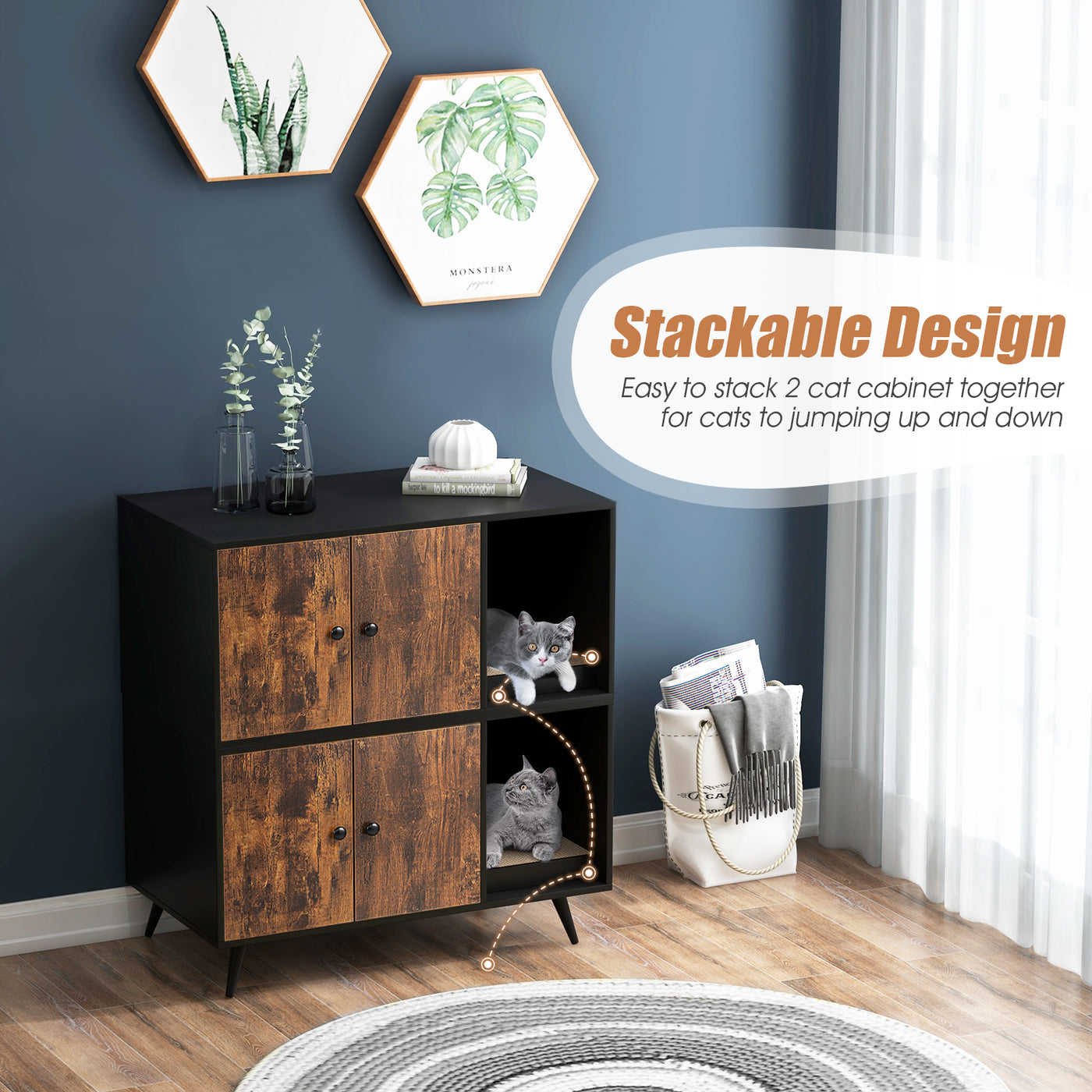 Bothered by your cat leaving litter everywhere? Our versatile cat litter box enclosure will provide you with the perfect solution. A private double door cabinet is perfect for hiding the litter box and avoiding odors. And the vent at the back of the cabinet facilitates air circulation. In addition, a winding walkway allows cats to access the cat scratch compartment and grind their claws, so you don't have to worry about the delicate furniture being destroyed! Due to its sleek design and a spacious desktop, you can also use it as a storage or side cabinet. Made from grade E0 engineered wood and supported by metal diagonal legs, this cat house ensures superior durability and stability. Besides, it is equipped with anti-tipping device, let you rest assured to use! So don't hesitate to bring it home as a gift for you furry friends! Private and Pet Friendly Cabinet: A large double door cabinet is designed for hiding cat litter box to avoid unpleasant odor and messy room. Or you can put a cat bed in it to provide a comfortable resting area for cats. And the 3 large air holes will ensure excellent ventilation and bright vision for cats. Release Cats Natural Instinct: Coming with a thick cat scratch pad, your cats' scratching instincts will be fully satisfied. Besides, it's an effective way to clean your cat's food scraps and distract your furry friend from your furniture. What's more, there is a winding entry to satisfy the cat's curiosity and need to explore. Upgraded Stability and Durability: Made of premium EO grade engineered wood and MDF, the indoor cat house is more solid, wear-resistant to support longer time. In addition, the cat washroom cabinet is equipped with unique slanted metal legs and anti-tipping device to improve overall stability and prevent wobbling. More than A Cat House: Equipped with a large cabinet, the cat house is a perfect way to conceal cat litter box. Besides, a spacious tabletop offers more space to put potted plants, photo frames, books or other items, making it a useful side cabinet. And its stylish design can easily blend well into various occasions. Easy to Assemble and Clean: All the necessary parts are numbered in the detailed instruction, so you could easily follow it to assemble the cat house furniture. Meanwhile, the smooth surface of the cat house is waterproof, so you can simply keep it clean with a wet cloth.
