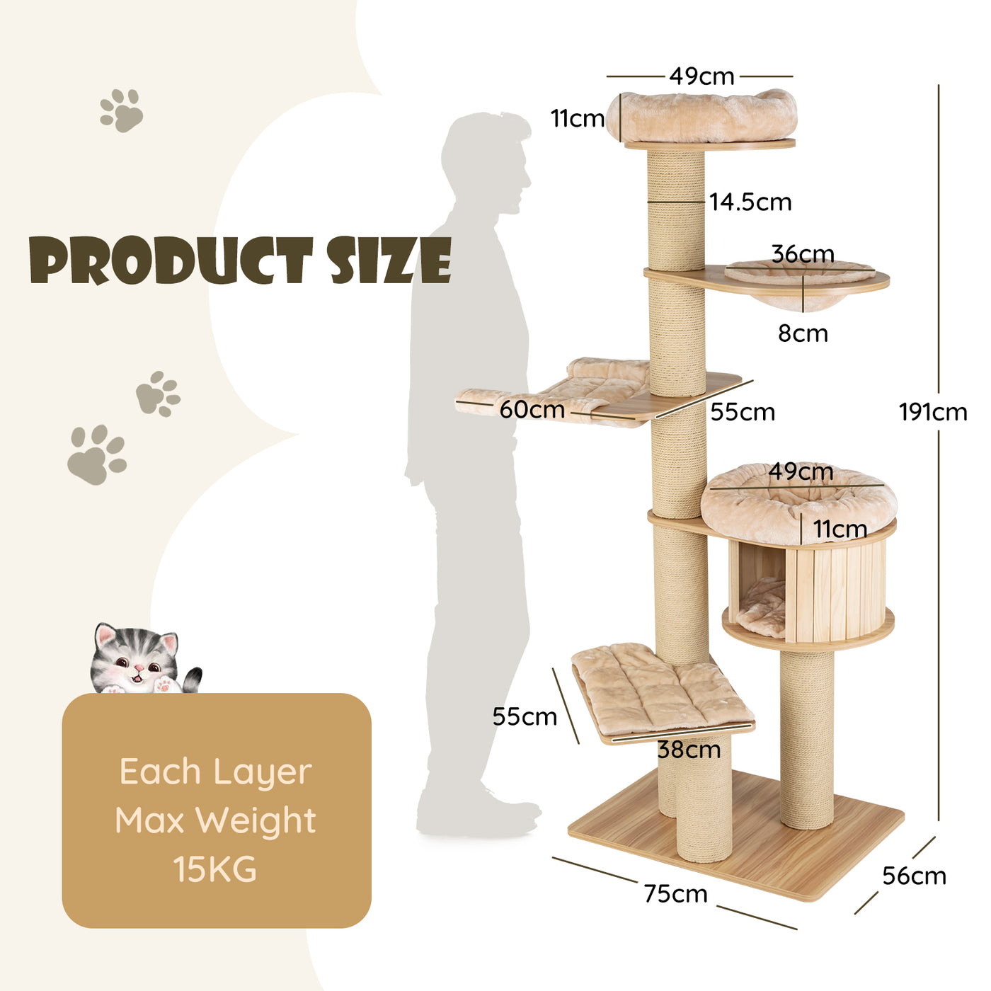 Colour: Beige Material: Engineered Wood, Pine Wood, Paper Rope Overall size: 75 cm x 56 cm x 191 cm (L X W X H) Top Perch Size: 49 cm x 49 cm x 11 cm (L X W X H) Basket Bed Size: 36 cm x 36 cm x 8 cm (L X W X H) Net weight: 28 kg Max Weight capacity : 15 kg Box Qty:1(May vary by batch)Package includes: 1 x Multi-level Cat Tree 1 x Instruction