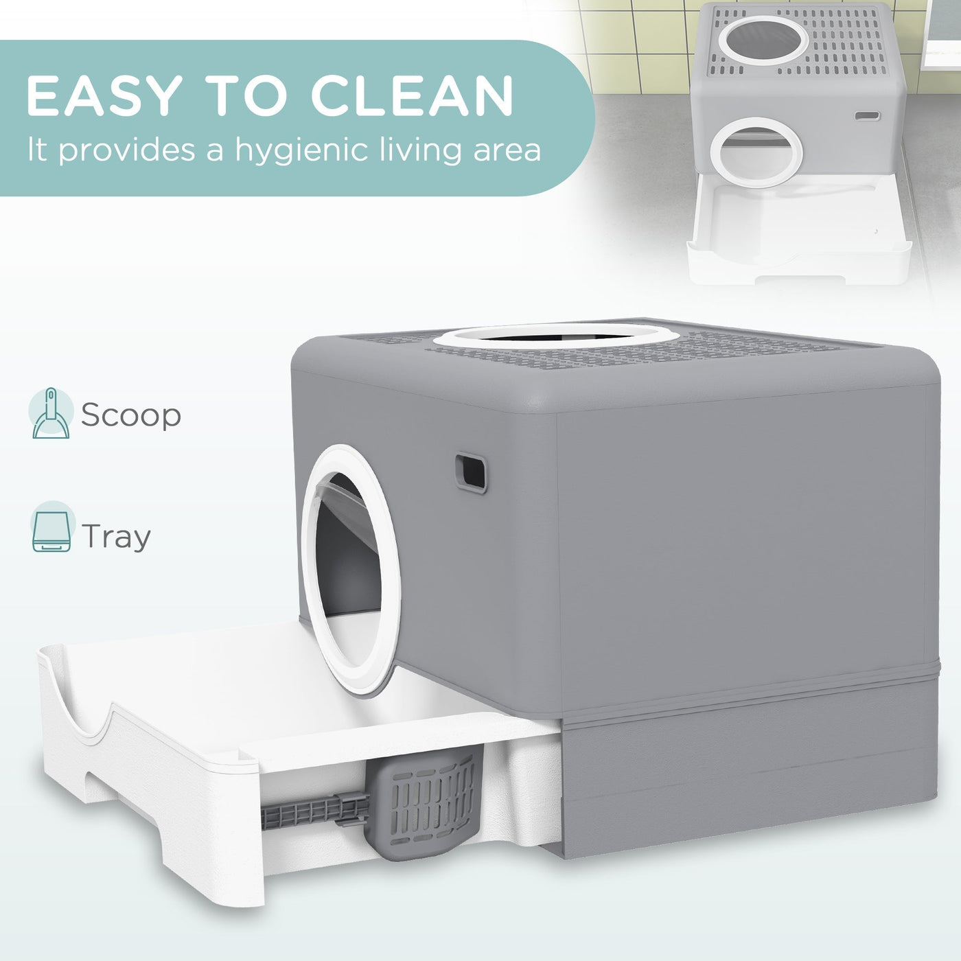 PawHut Enclosed Cat Litter Box, with Lid, Front Entry, Top Exit, Pull-Out Tray, Scoop - Grey - Grey