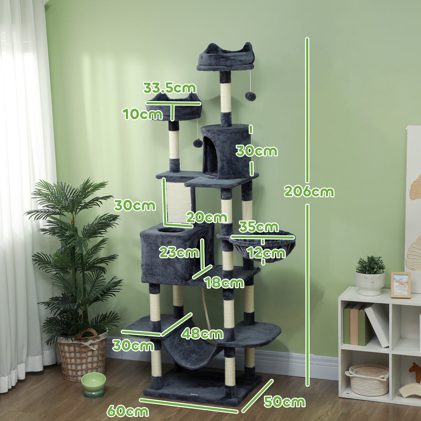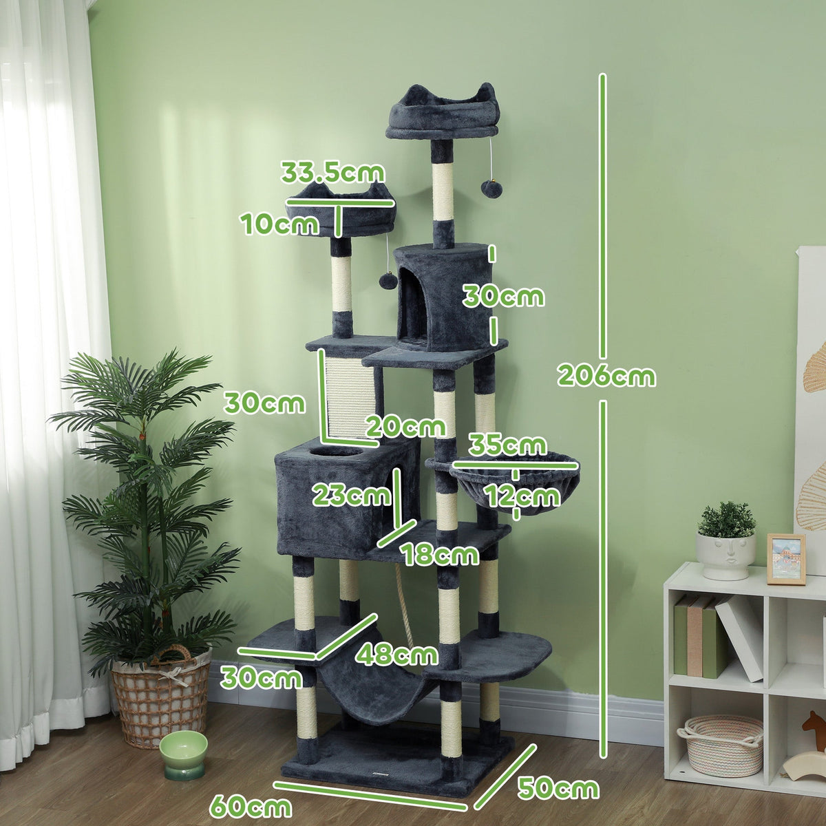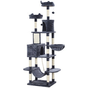 PawHut 206cm Cat Tree, Multi-Level Cat Tower with Scratching Posts and Board, Beds, Condos, Platforms, Toy Balls, Dark Grey - Dark Grey