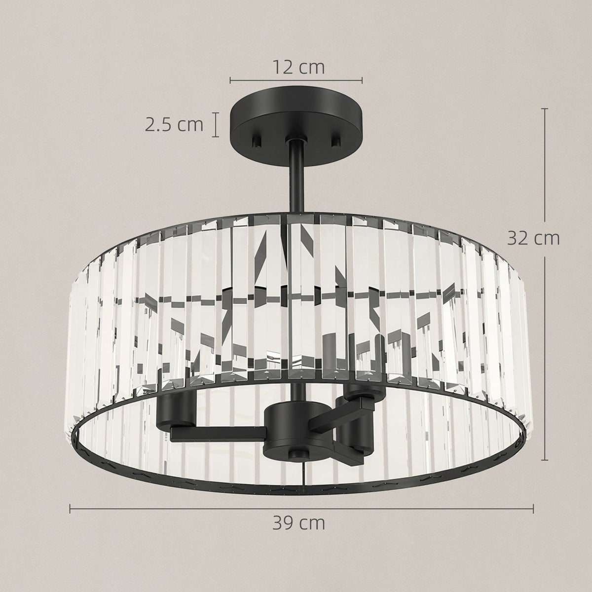HOMCOM Crystal Ceiling Light, Semi Flush Mount Modern Crystal Chandelier Ceiling Light, E14 Base 3-Lights, Bulbs Not Included - Black