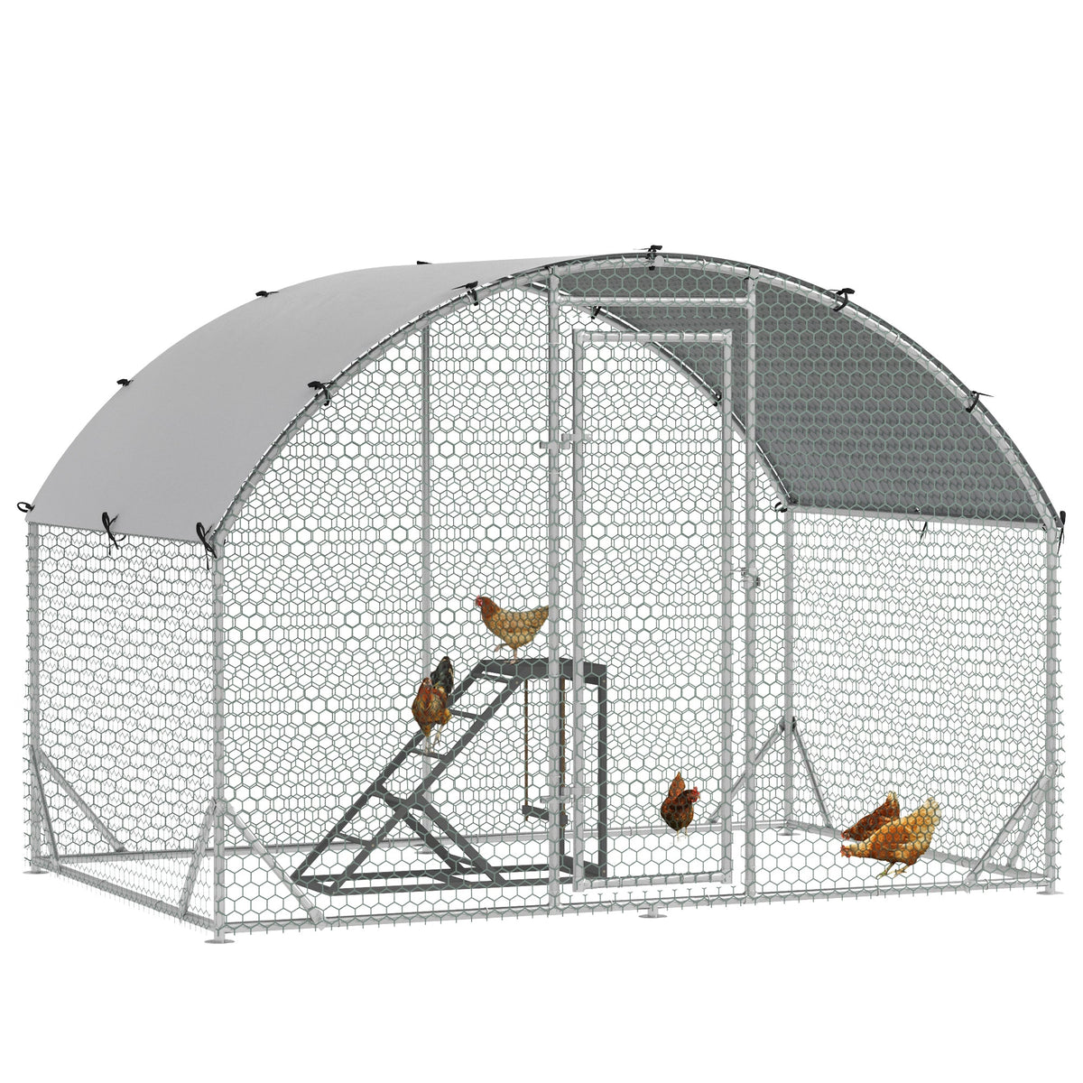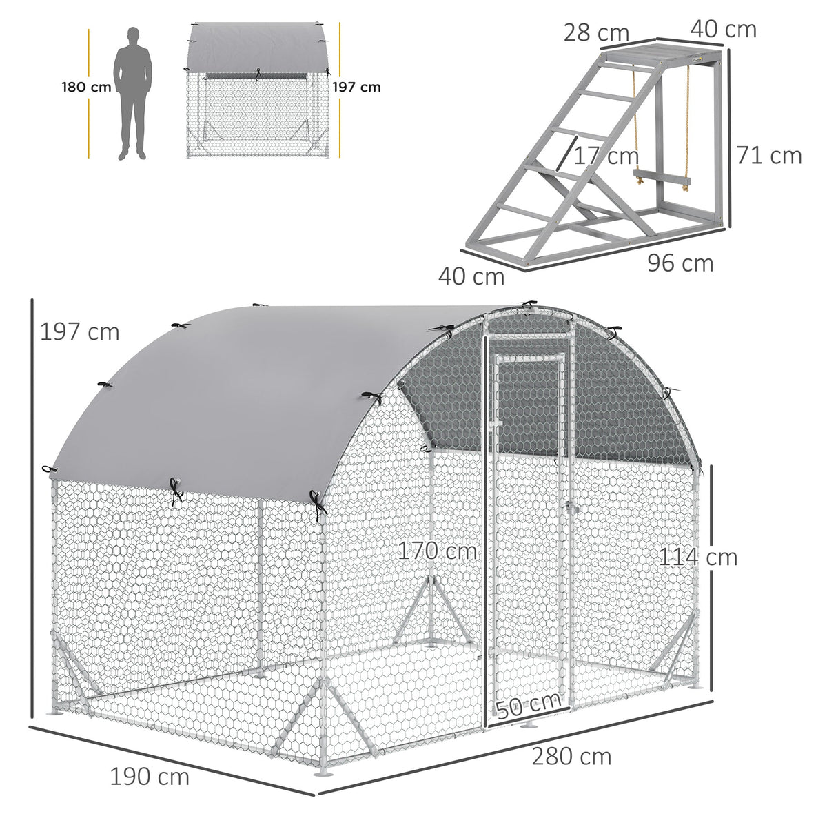 PawHut Walk-In Chicken Run, Metal Chicken Coop with Cover, Outdoor Hen Poultry House Cage with Chicken Activity Shelf, for Chickens, Rabbits, Ducks, 2.8 x 1.9 x 2m - Silver
