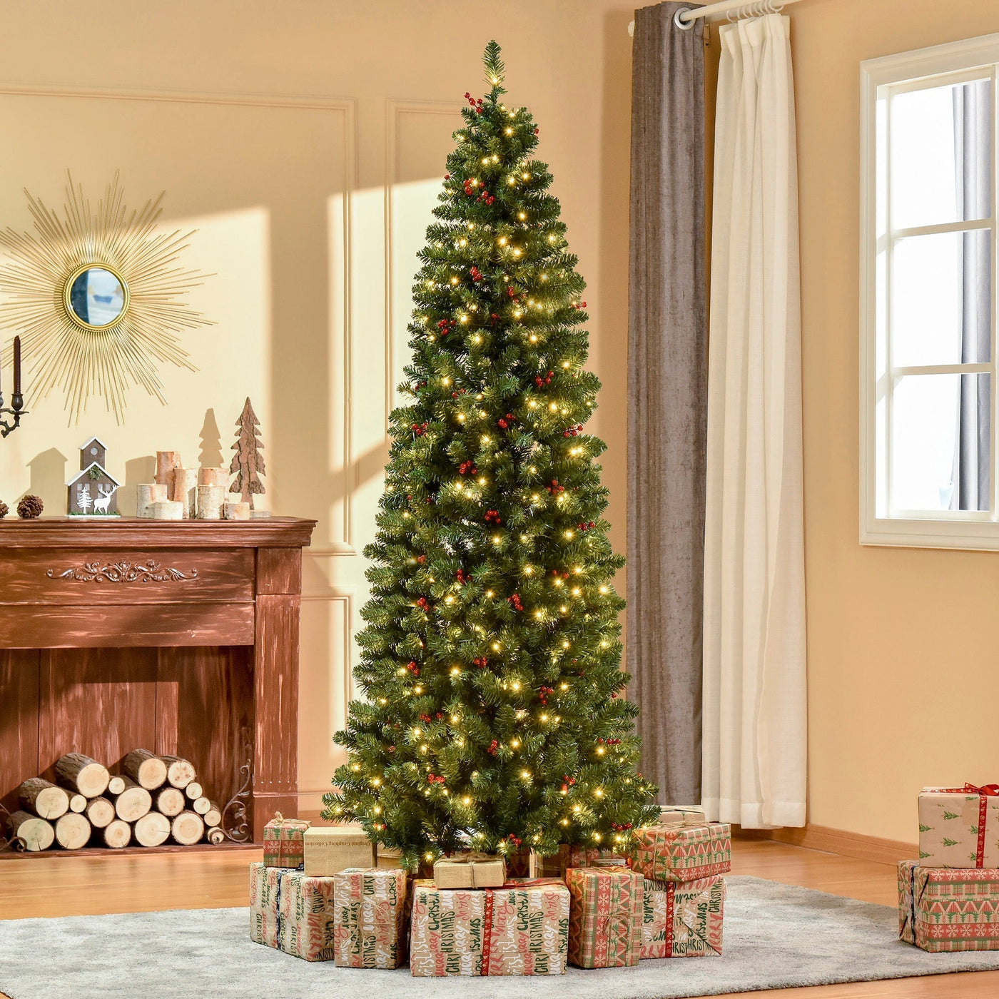 HOMCOM 7FT Prelit Artificial Pencil Christmas Tree with Warm White LED Light, Red Berry, Holiday Home Xmas Decoration, Green - Green