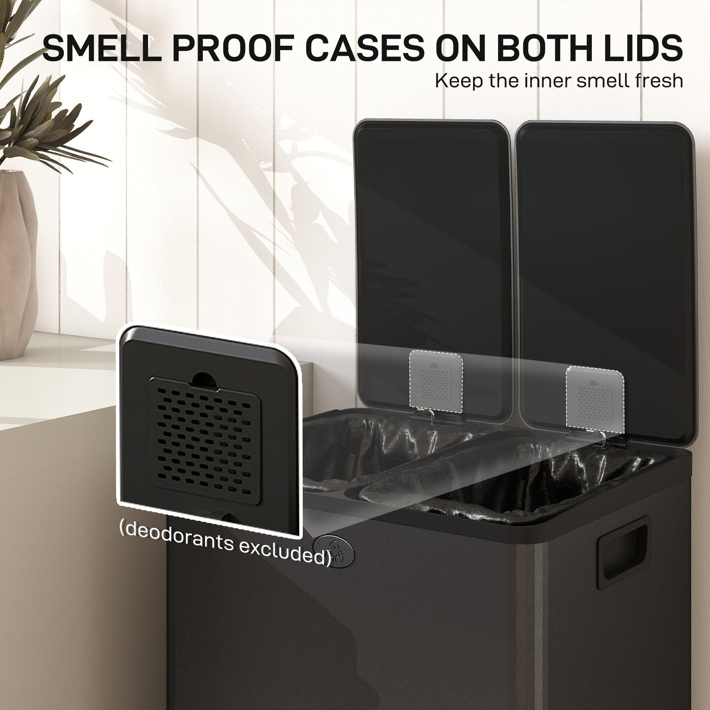 HOMCOM 56L Dual Compartment Stainless Steel Bin, with Deodoriser Holders - Black - Black