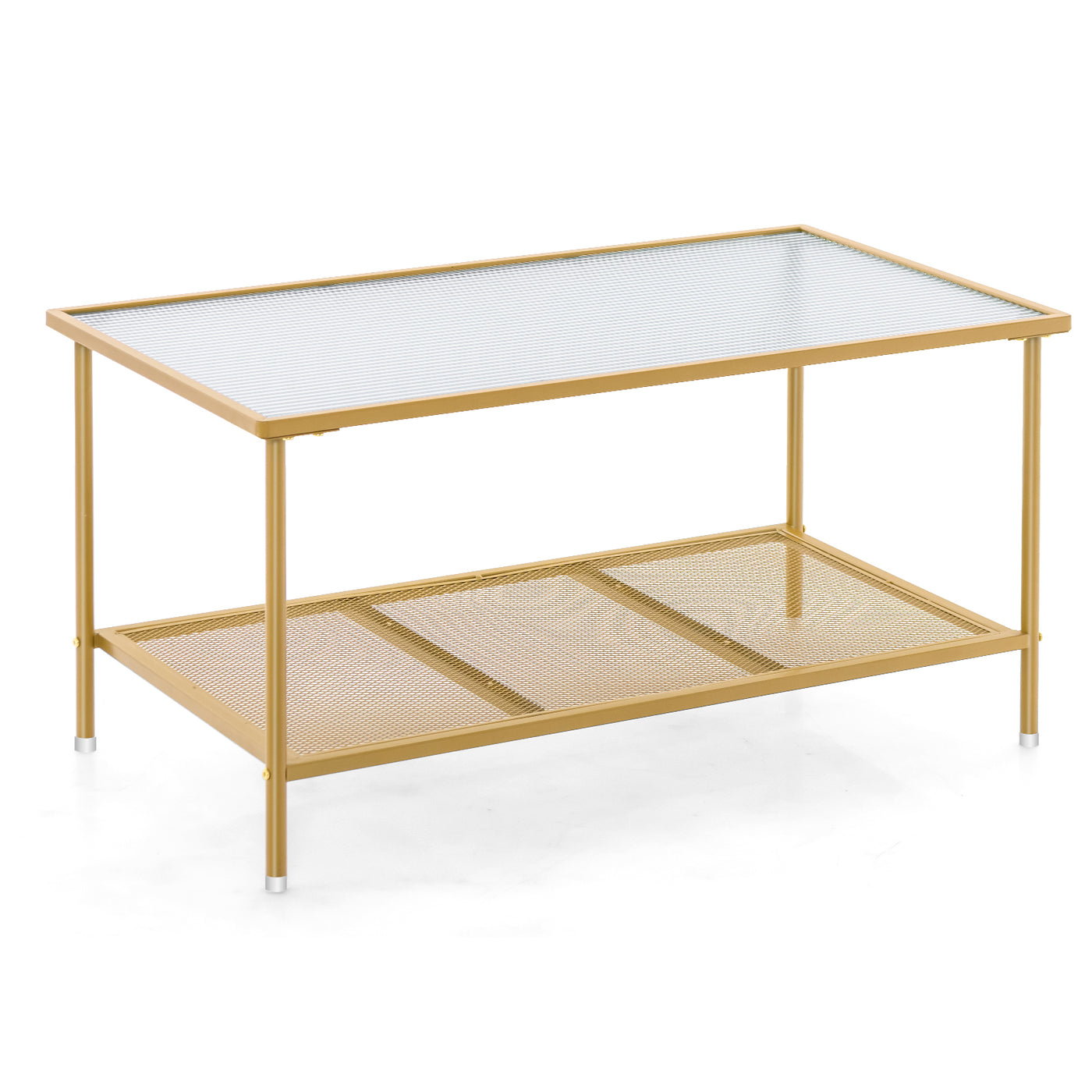 Colour: Golden Material: Metal, Tempered Glass Overall Dimension: 90 x 50 x 46 cm (L x W x H) Size of Open Shelf: 82 x 46 cm (L x W) Distance Between Tabletop and Shelf: 32 cm Height off the Ground: 10 cm Max Load Capacity of Tabletop: 45 kg Max Load Capacity of Shelf: 50 kg Net Weight: 7.5 kg Box Qty:1(May vary by batch)Package Includes: 1 x Coffee Table 1 x Instruction Manual