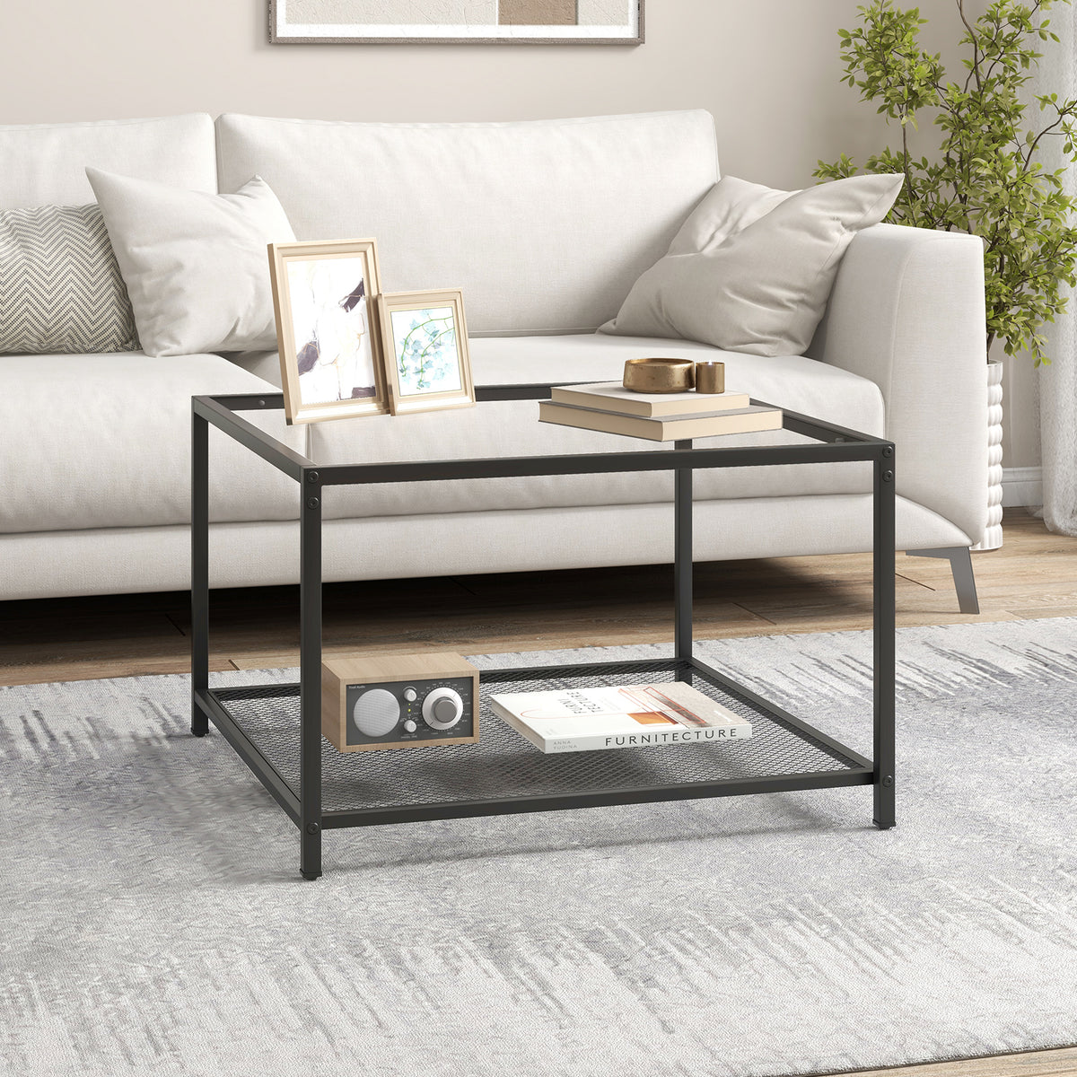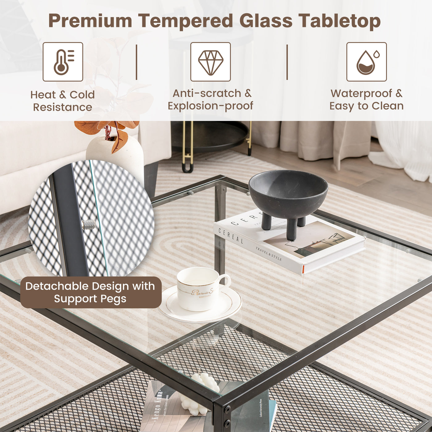 Modern 2-Tier Square Glass Coffee Table with Storage-Black
