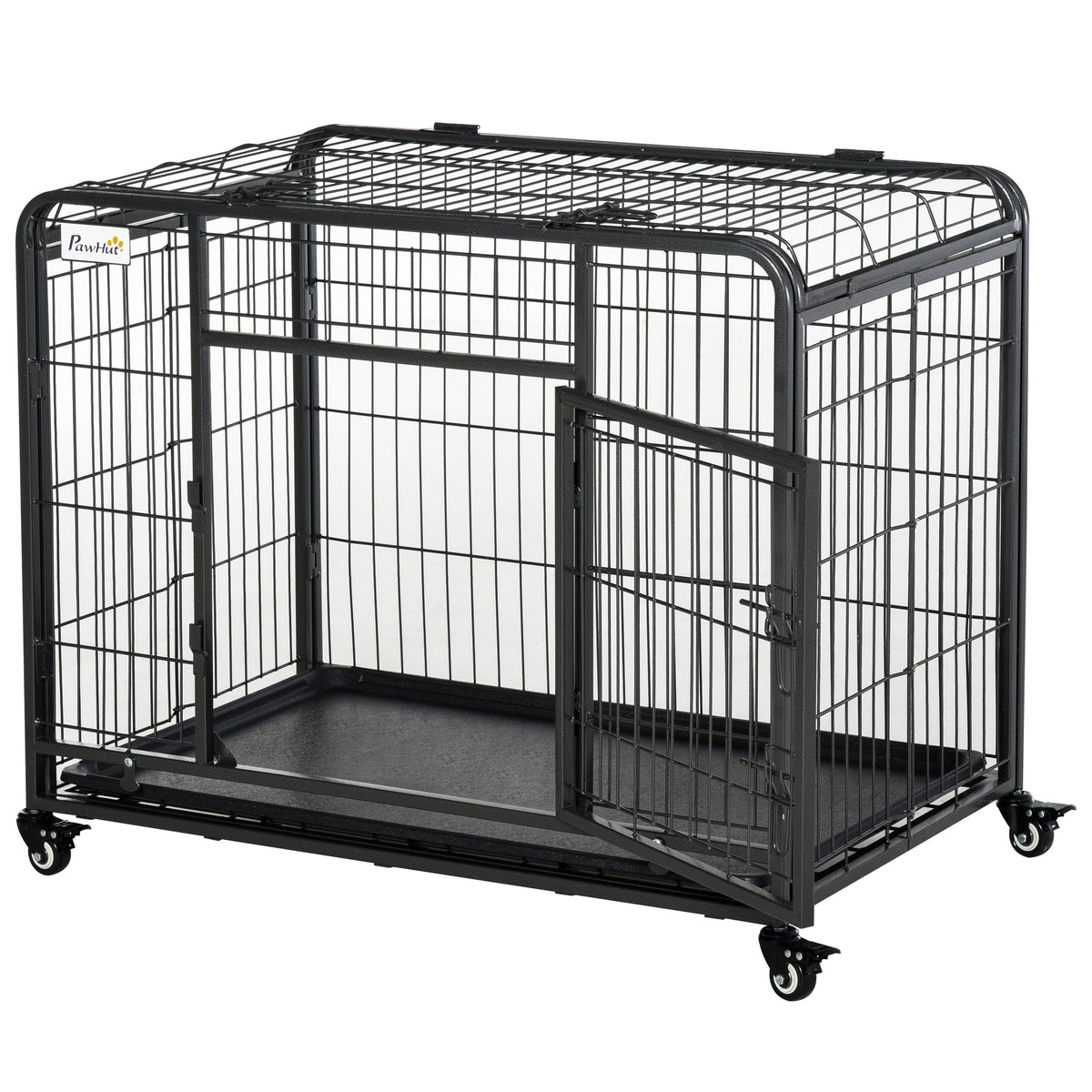 PawHut Metal Dog Cage Kennel Locking Door & Wheels Removable Tray Openable Top For Medium Pets 94 x 58 x 69.5 cm - Dark Grey