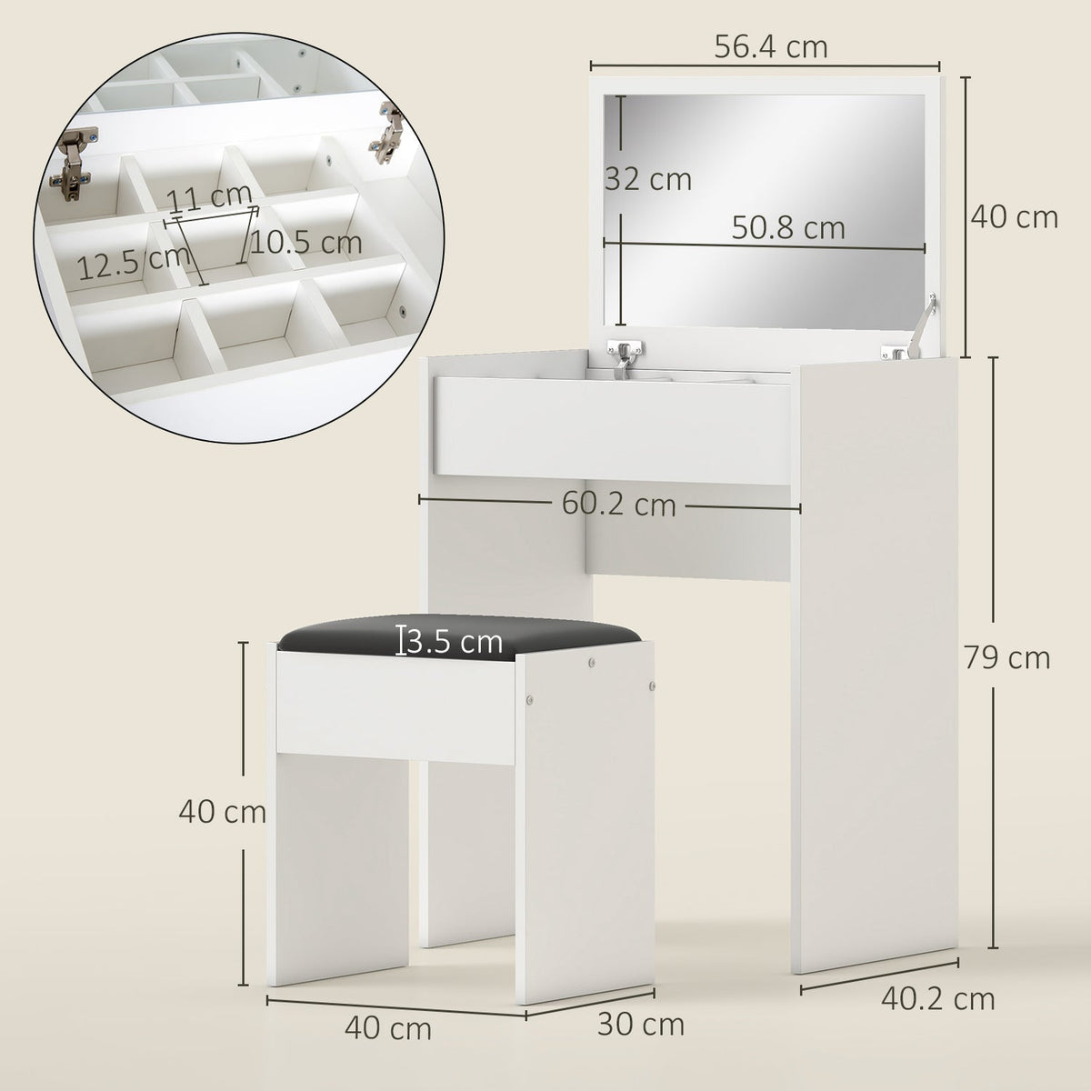 HOMCOM Dressing Table with Mirror and Stool, Vanity Makeup Table with Flip Up Mirror, Vanity Desk with Storage Unit and Padded Seat, White - White