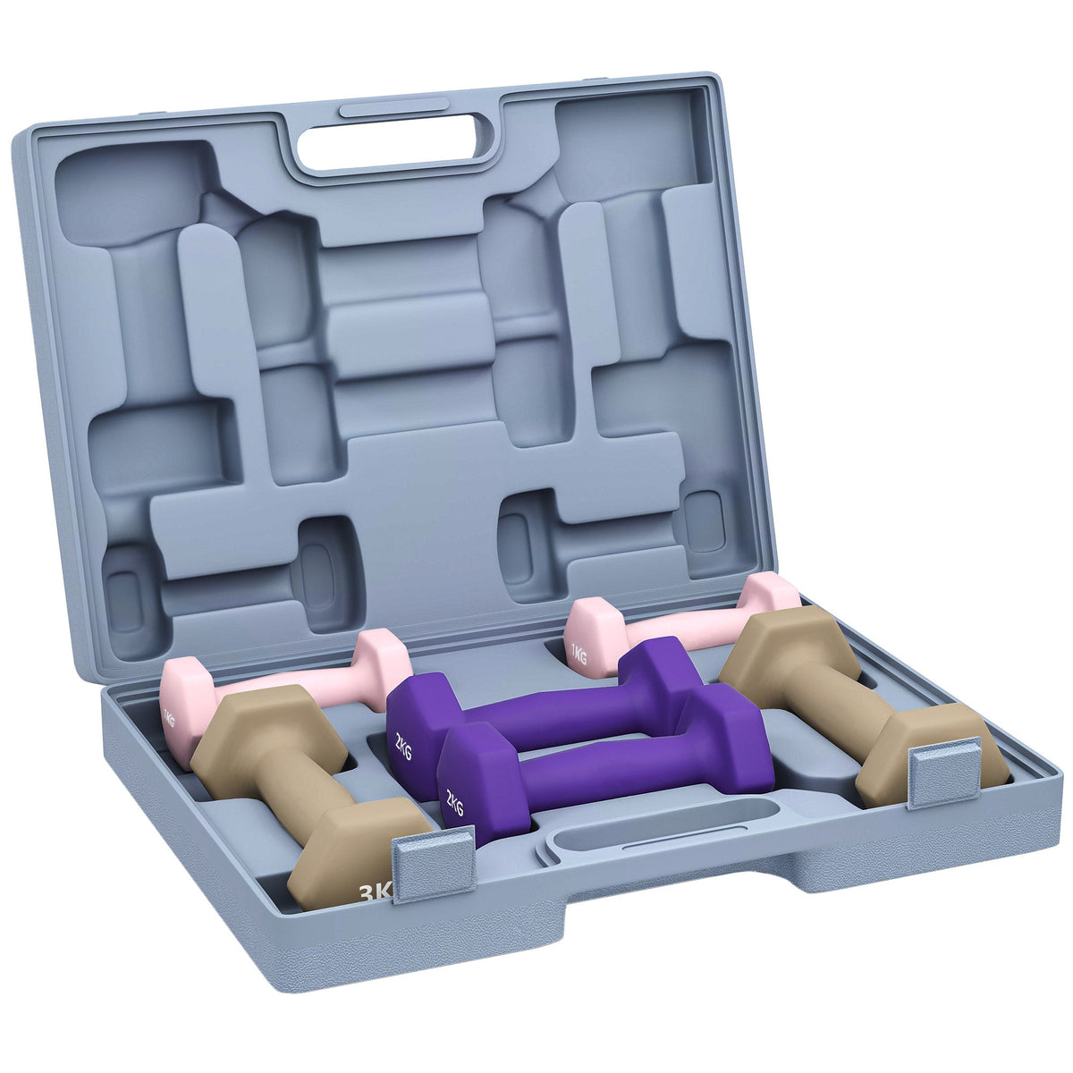 SPORTNOW 12kg Hex Dumbbells Set of 6, Hand Weights with Carry Case for Home Gym Strength Training, 2 x 1kg, 2 x 2kg, 2 x 3kg - Pink, purple and brown