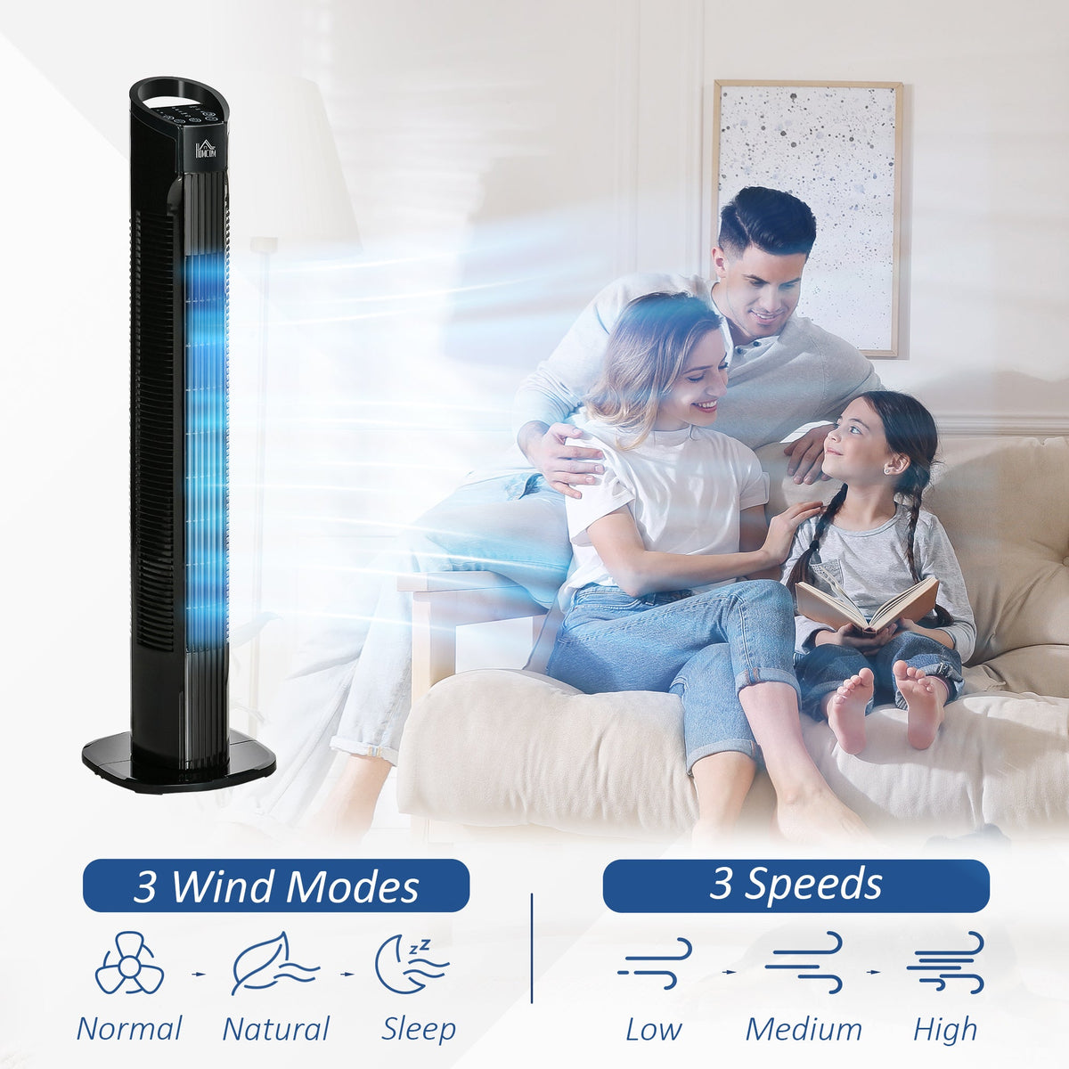 HOMCOM 31" Freestanding Tower Fan, 3 Speed 3 Mode, 7.5H Timer, Oscillating, LED Panel, Remote Control, 31 Inch Standing Fan, Black - Black