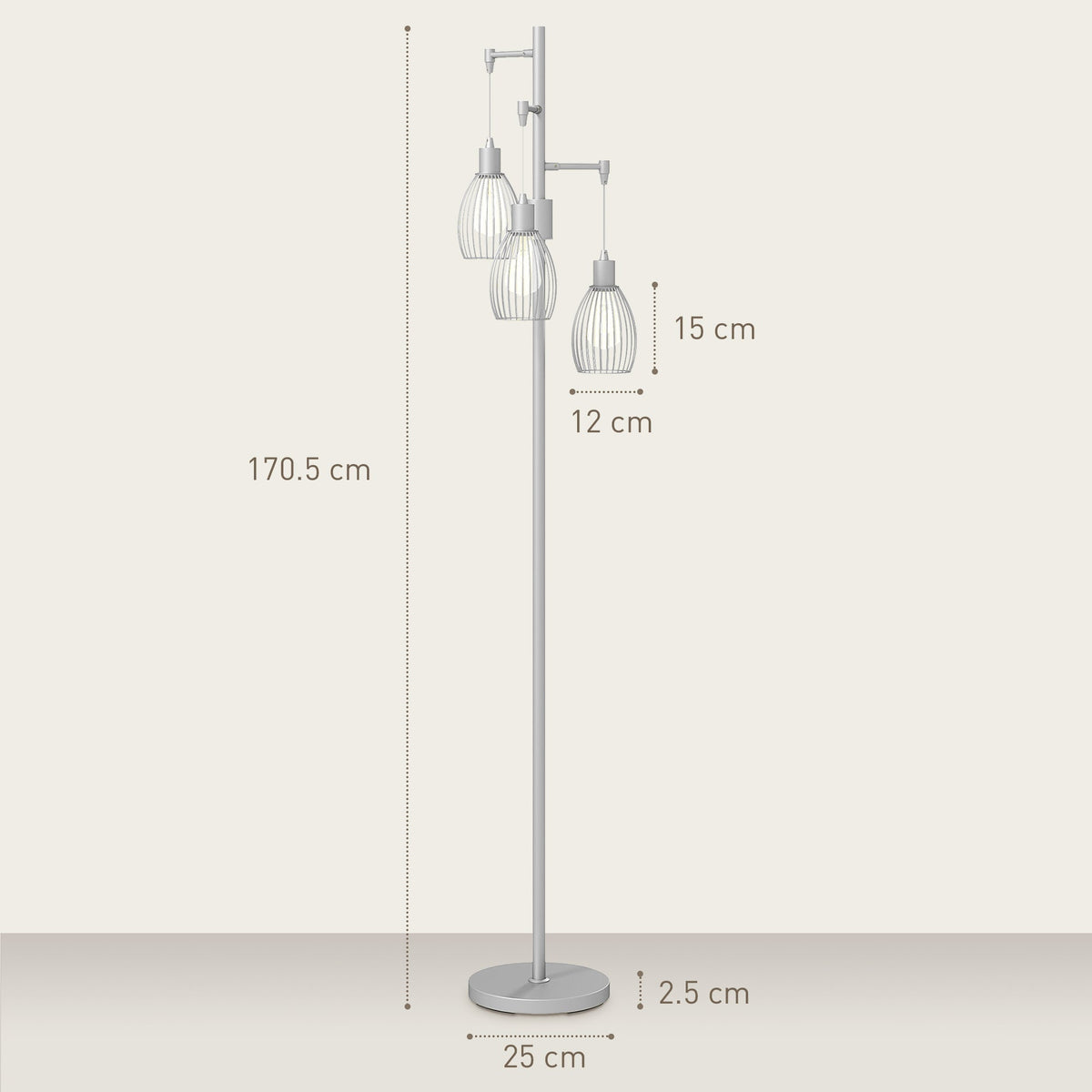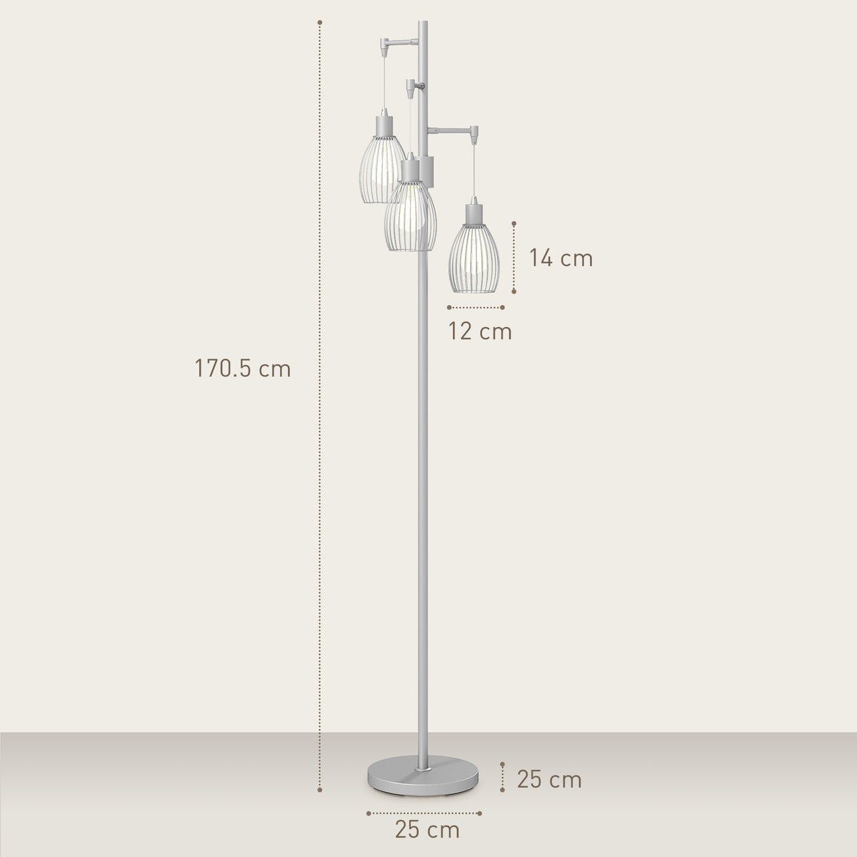 HOMCOM 3-Light Floor Lamp, 170cm Industrial Dimmable Standing Lamp with Steel Wire Cage Lampshades for Living Room, Bedroom, Dining Room, Study, Silver Tone - Silver
