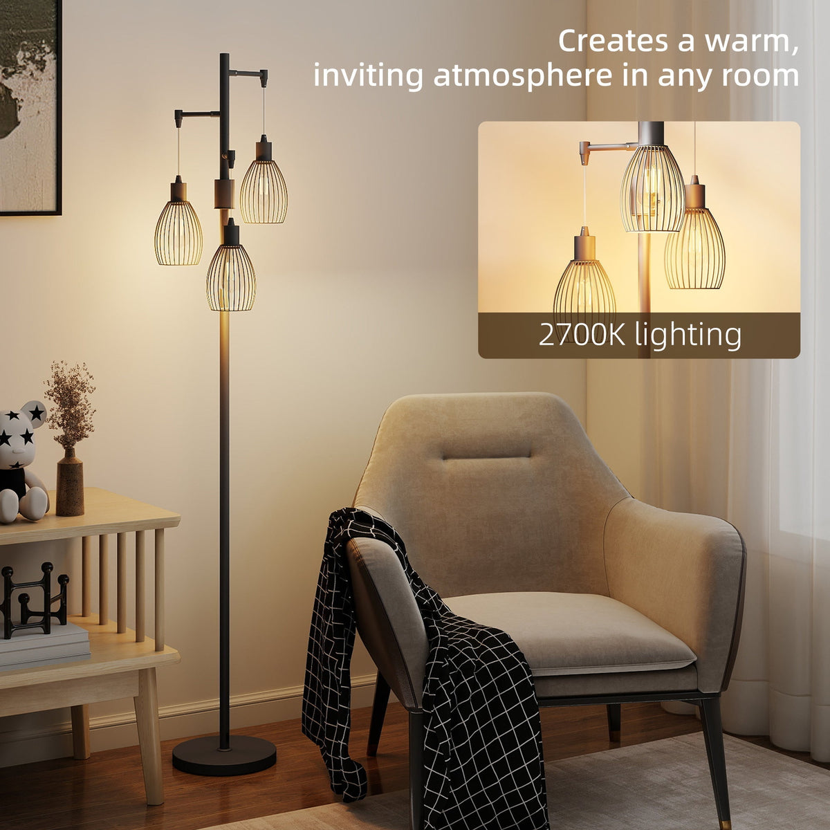 HOMCOM 3-Light LED Floor Lamp, 170cm Industrial Dimmable Standing Lamp with Steel Wire Cage Lampshades, 2700K for Living Room, Bedroom, Dining Room, Study, Black - Black