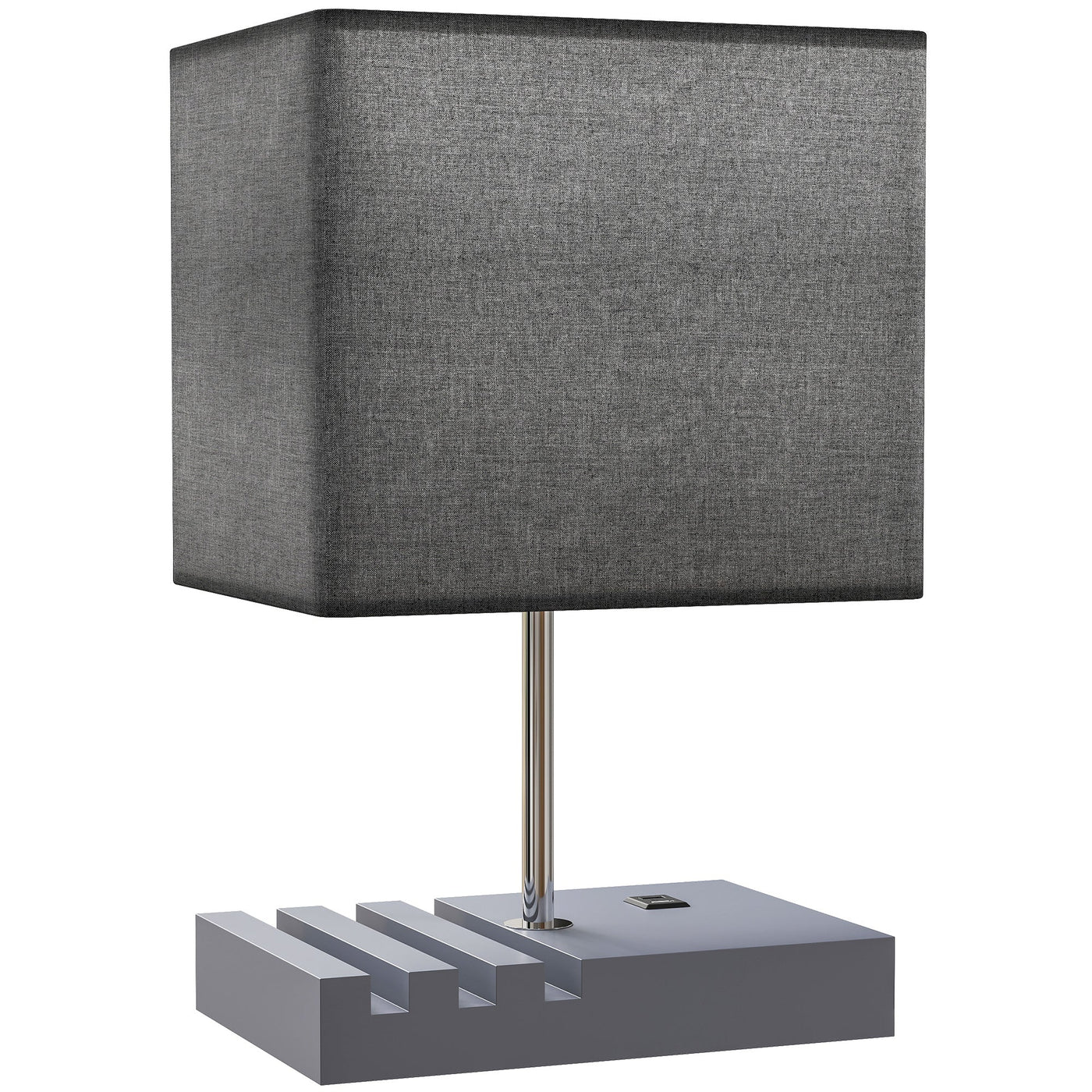 HOMCOM Bedside Lamp with USB A+C Charging Ports and 3 Phone Stands, Modern Table Lamp with Solid Wood Base and Fabric Shade for Bedroom Living Room Office, E27 Socket, Bulb Not Included, Grey - Grey