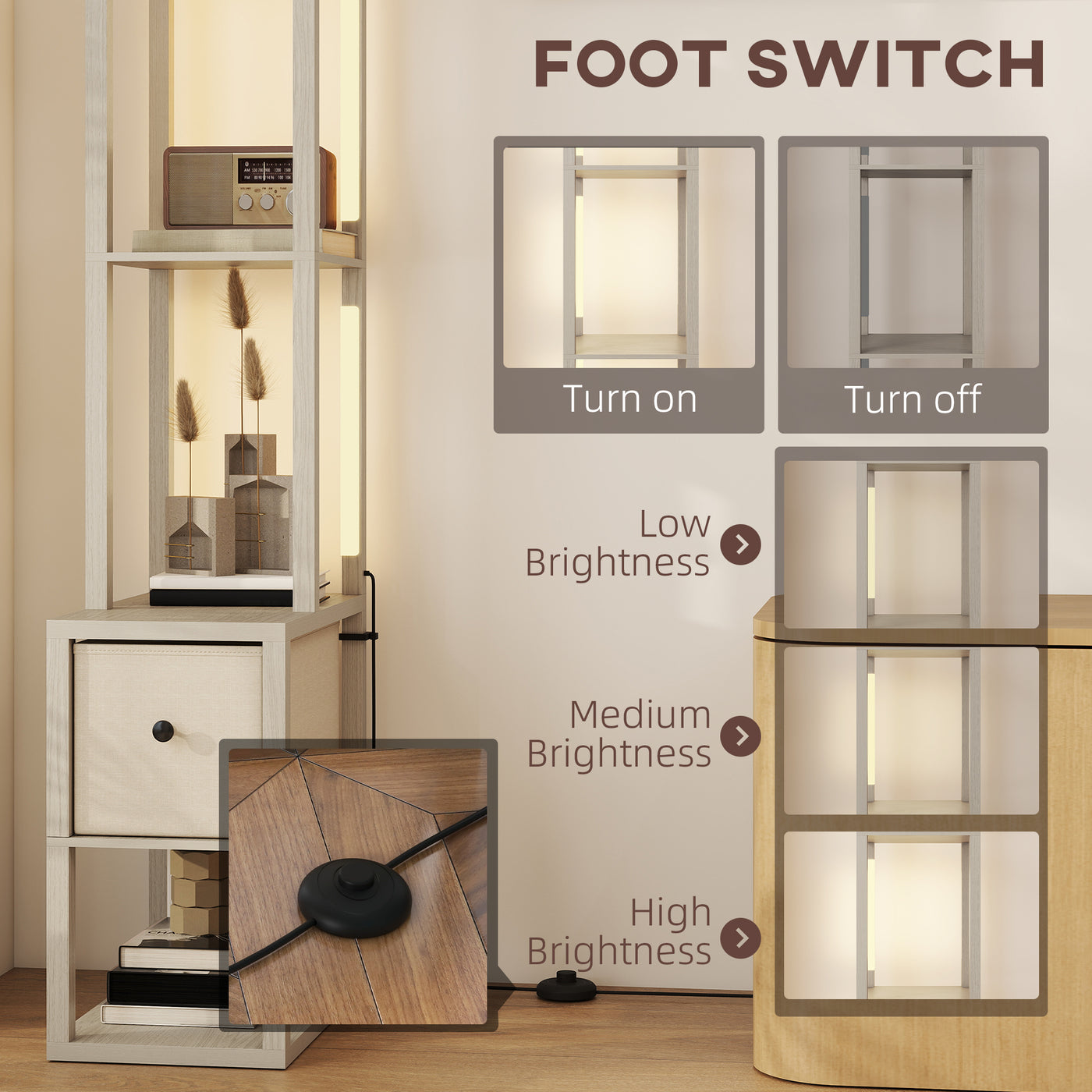 HOMCOM Floor Lamp with Shelves, LED Column Modern Standing Lamp with Fabric Drawer, Adjustable Brightness, Foot Switch for Living Room, Bedroom, Office, Oak - Oak