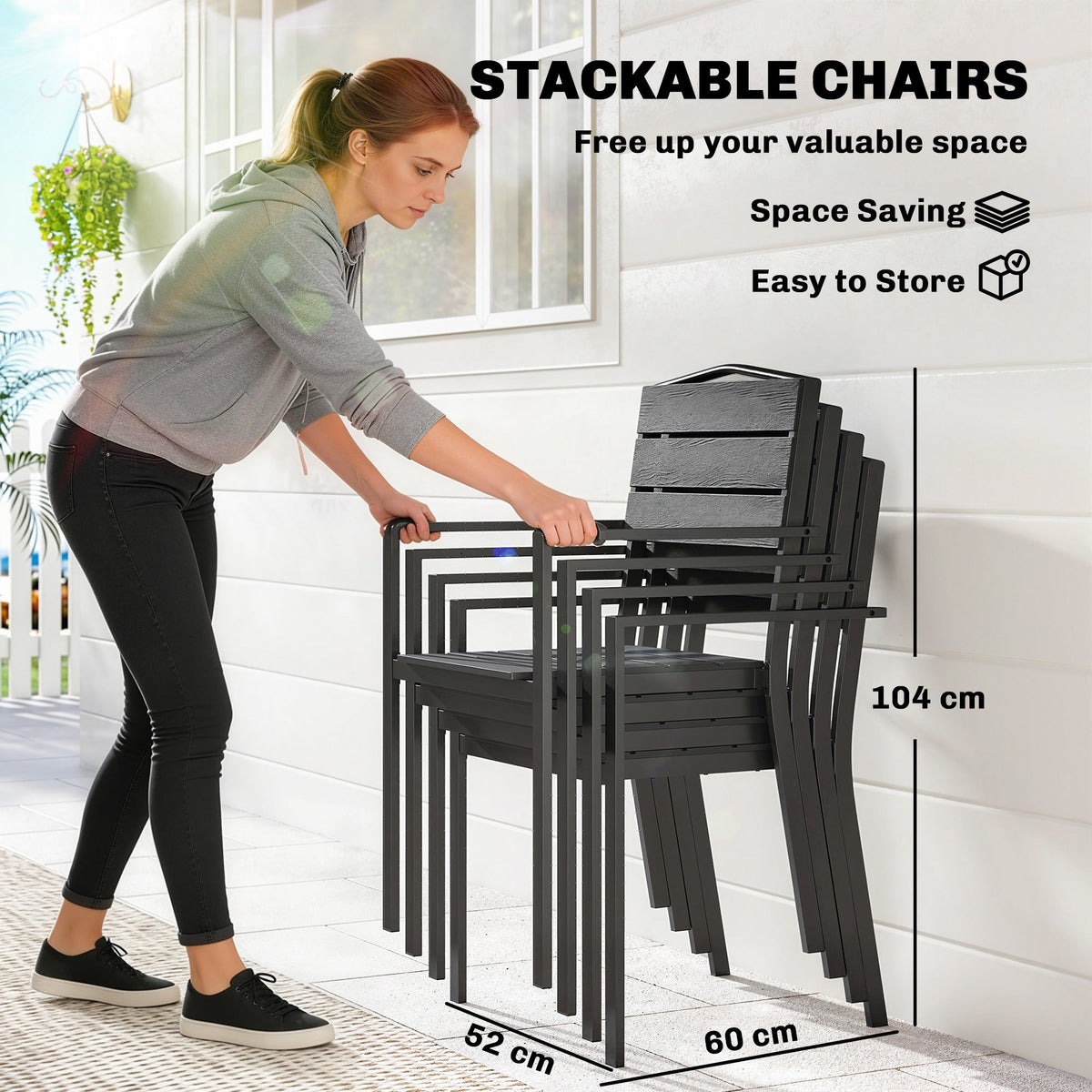 Outsunny Stackable Garden Chairs Set of 4, Garden Dining Chairs with Slatted HDPE Seat Back, Armrests, Metal Frame, Black - Black