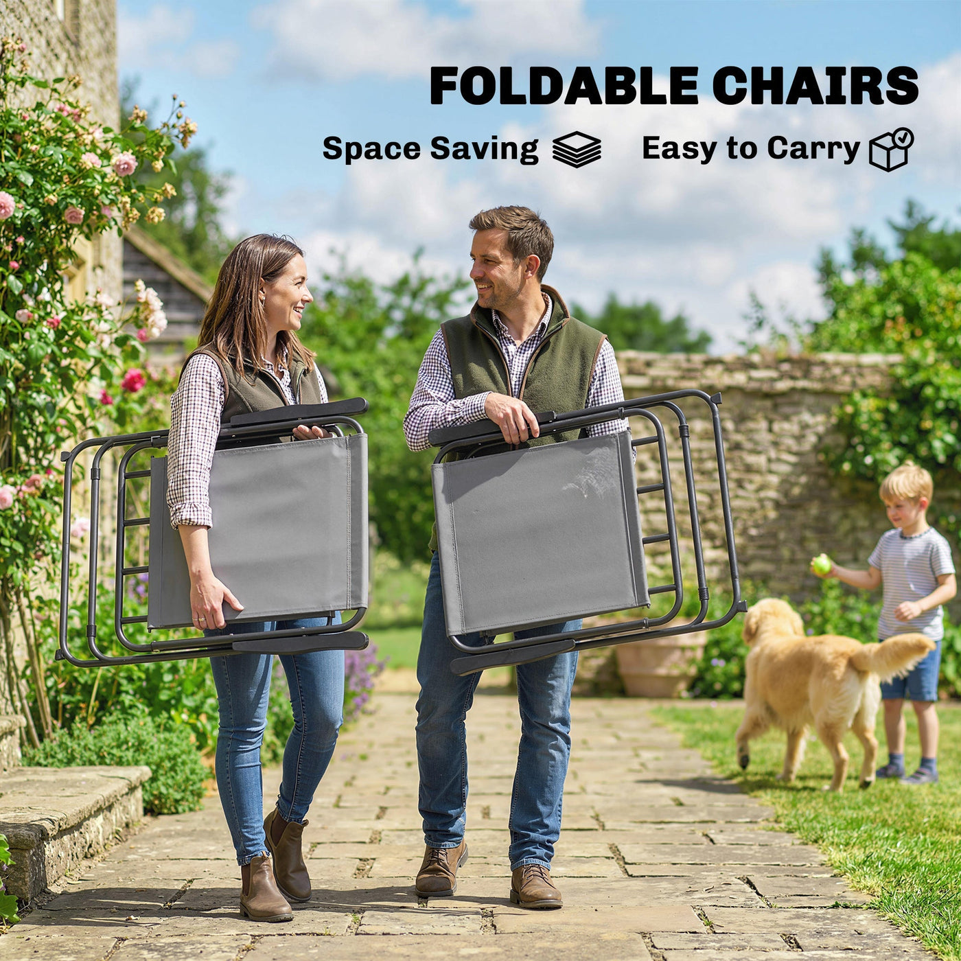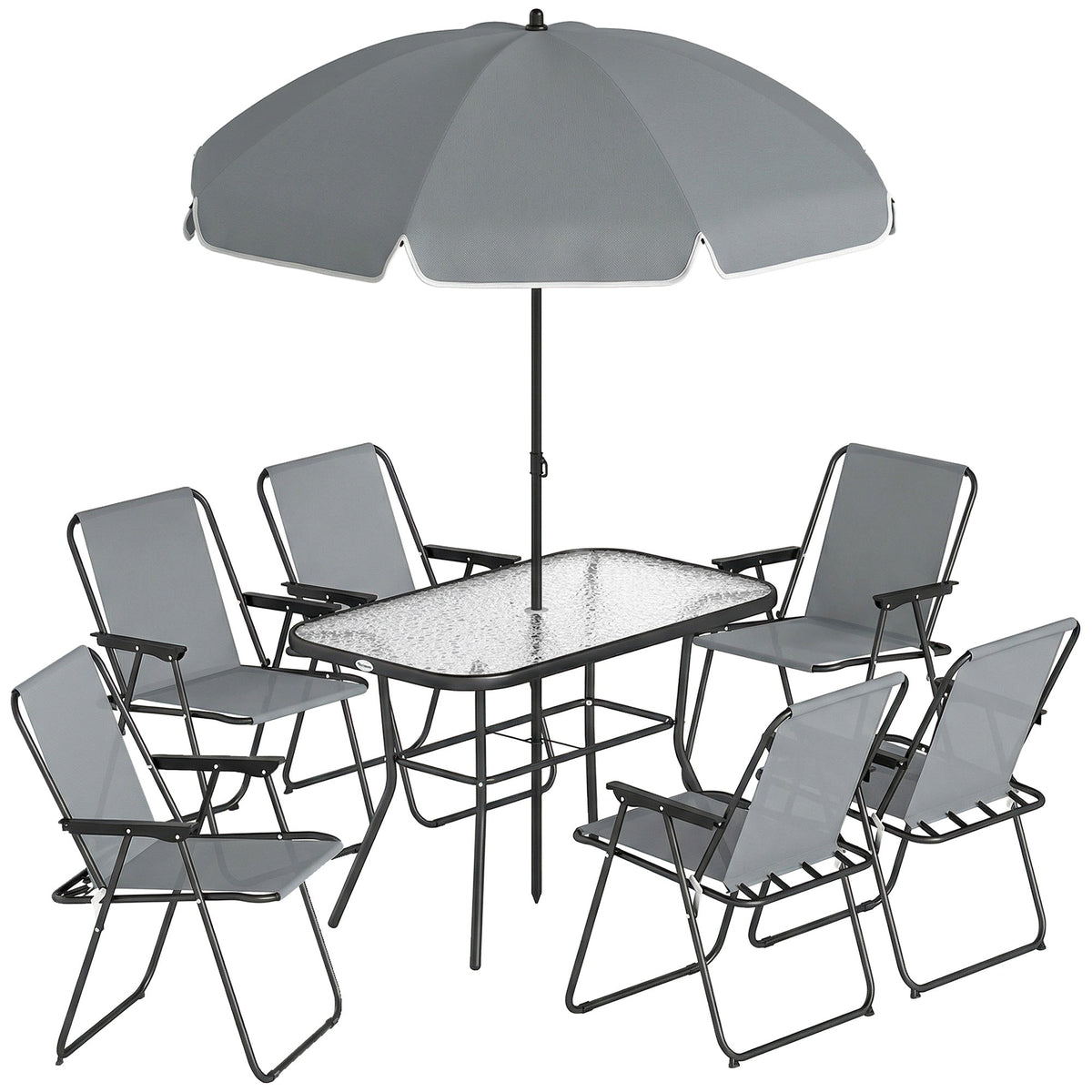 Outsunny 8 Piece Garden Dining Set with Umbrella, Garden Furniture Set with 6 Folding Chairs, Tempered Glass Table for Patio Grey - Grey