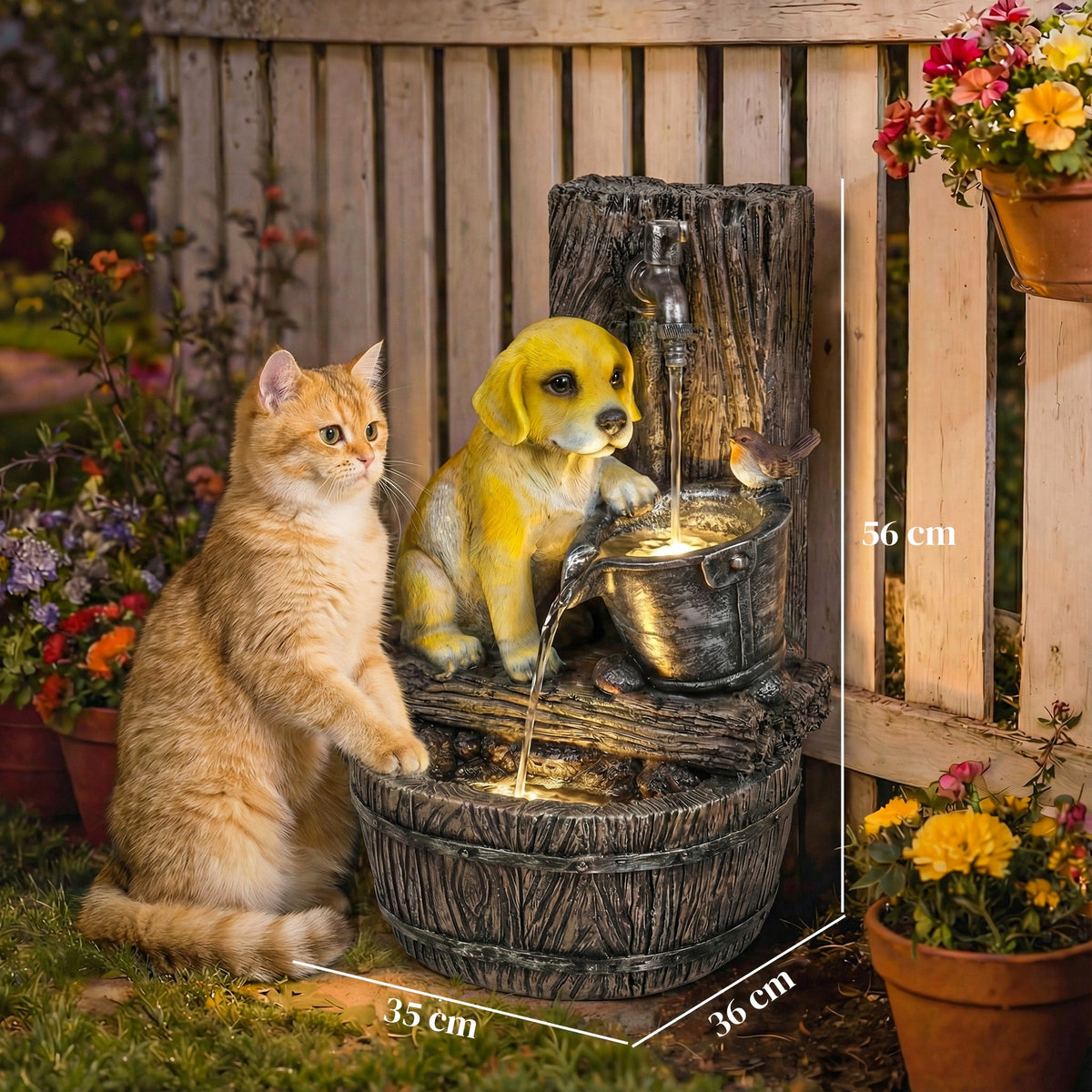 Outsunny Garden Water Feature with 3-Tier Rustic Puppy Design, Freestanding Resin with LED Lights, Adjustable Flow, Rustic Brown - Rustic Brown, Yellow