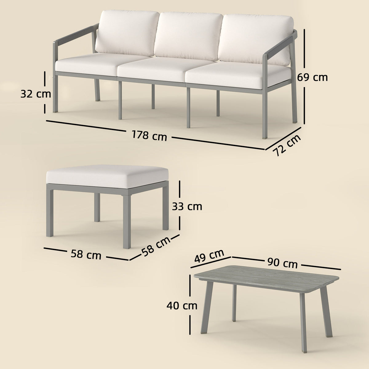Outsunny 3 Piece Garden Dining Set, Outdoor Patio Furniture with 3 Seater Sofa, Footstool, Coffee Table and Cuhsions - Grey