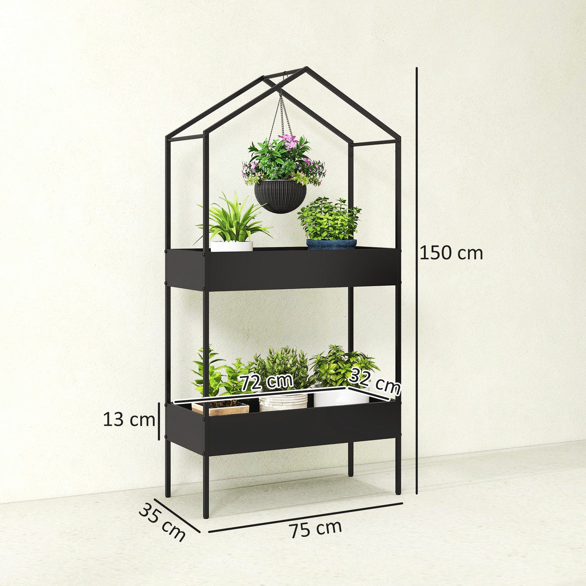 Outsunny 2 Tier Plant Stand, Outdoor Indoor Metal Plant Stand with Hook, House-Shaped Pots Holder Display Rack, Black - Black