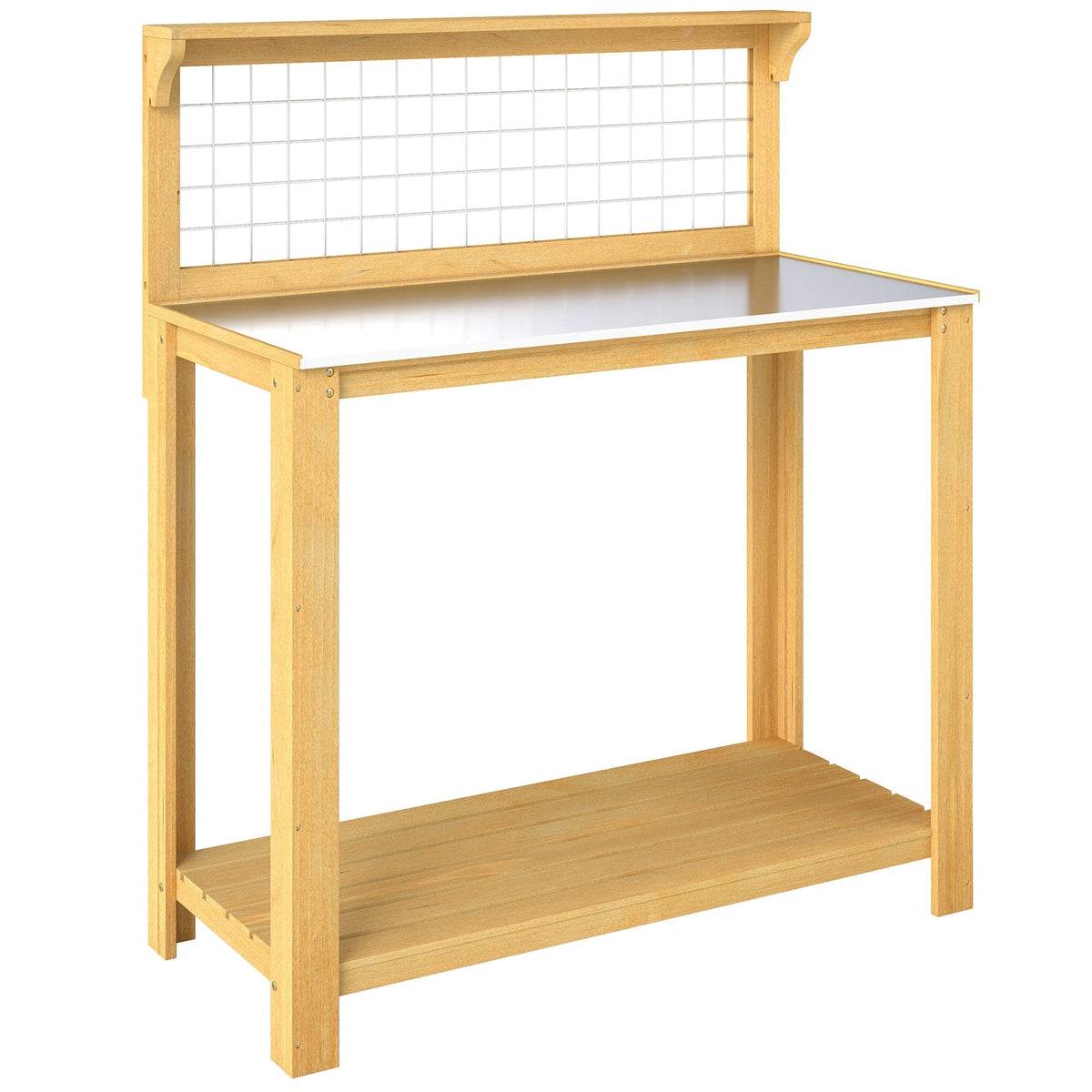 Outsunny Wooden Potting Bench Table with Aluminium Worktop, Outdoor Garden Workbench with 2 Shelves