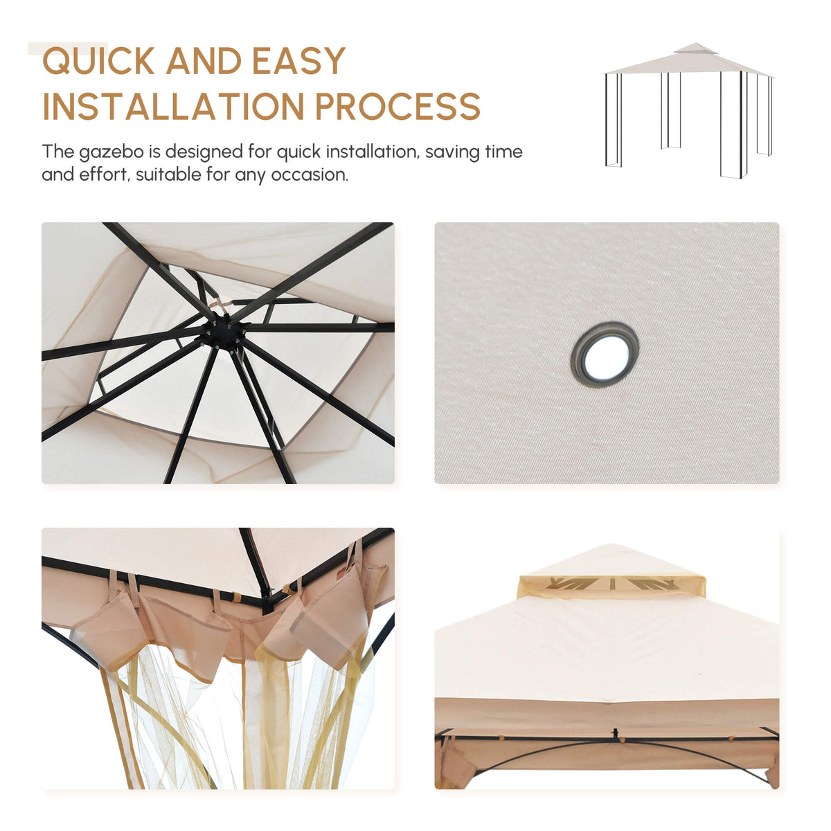 Outsunny 3 x 3(m) Garden Gazebo Patio Party Tent Shelter Outdoor Canopy Double Tier Sun Shade Metal Frame Netting, Beige - Beige, Black
