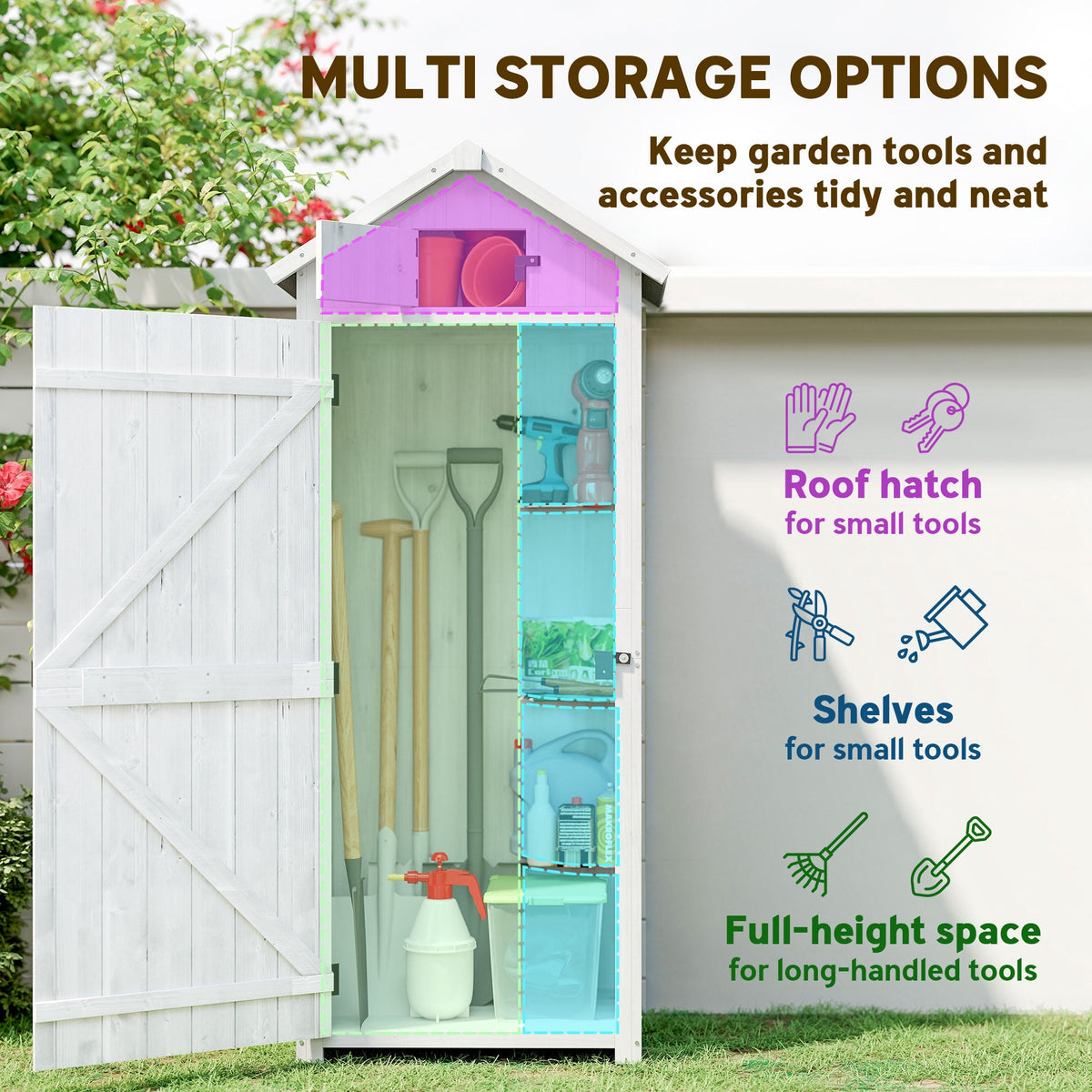 Outsunny Small Shed, Tall Slim Wooden Garden Shed with 3 Removable Shelves and Roof Hatch, Compact Outdoor Tool Storage Cabinet with Asphalt Roof and Door Latch, 77 x 54.2 x 179 cm, Light Grey
