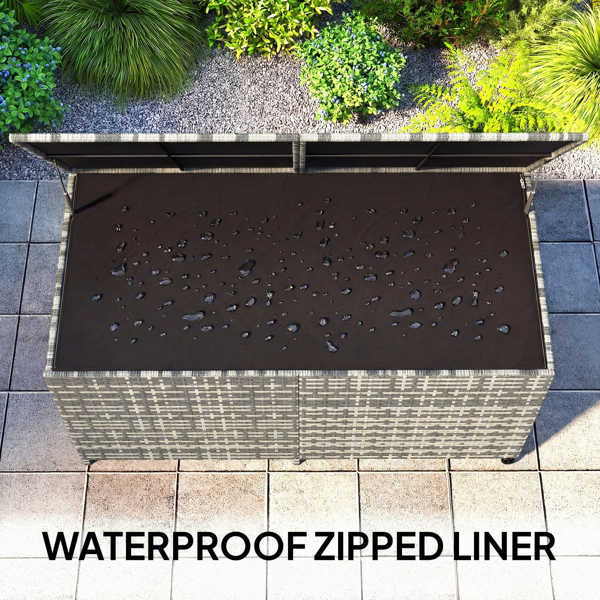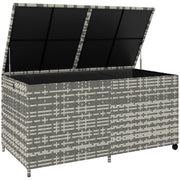 Outsunny 650L Garden Storage Box with 2 Wheels, Rattan Deck Box with Waterproof Zipped Liner, Safe Pneumatic Rods, Mixed Grey - Mixed-grey
