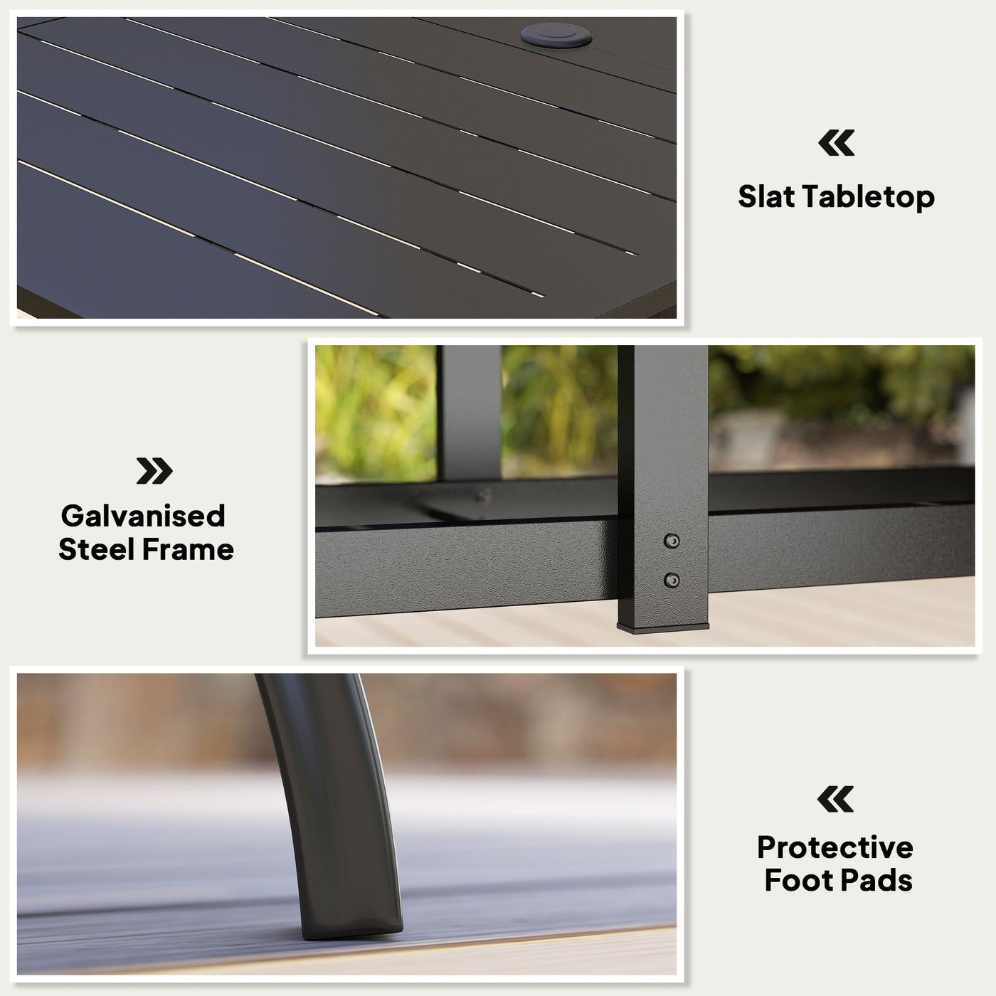 Outsunny Rectangle Garden Dining Table with Parasol Hole, Patio Table with Steel Frame and Slat Tabletop, 150cm x 90cm, Black - Black