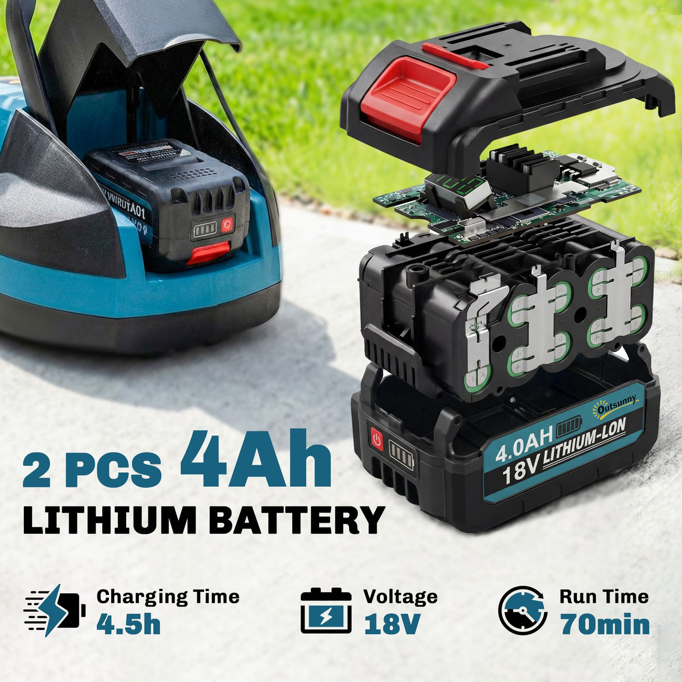 Outsunny 18V Cordless Lawnmower with 2 x 4Ah Batteries & Charger, Battery Lawn Mower with 21cm Cutting Width, 3 Cutting Heights - Blue