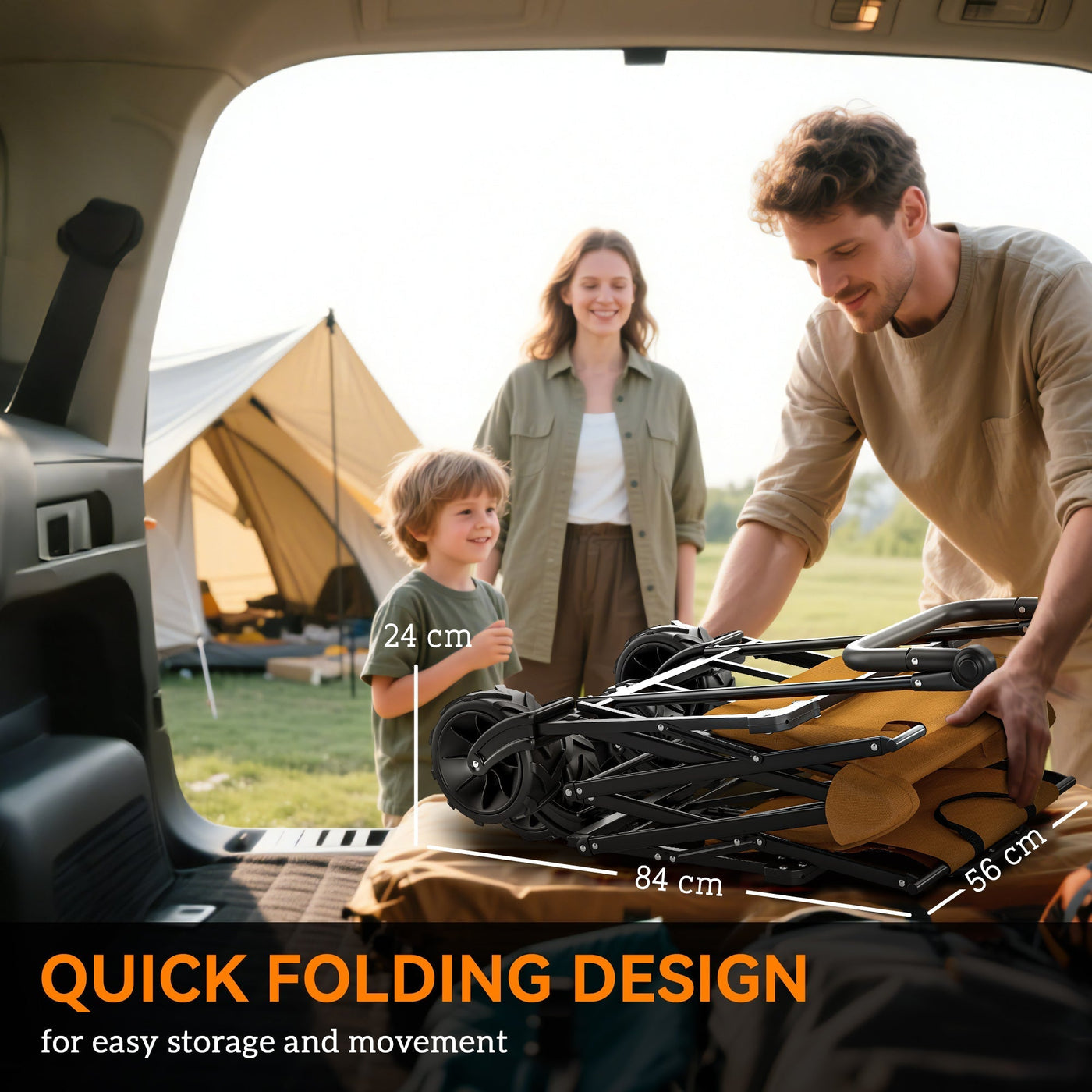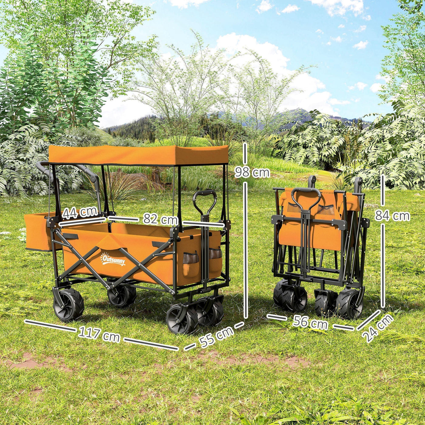 Outsunny 120L Festival Trolley on Wheels, Folding Camping Trolley Cart with Removable Canopy, All-Terrain Wheels, Adjustable Handle, Push or Pull for Garden Beach Fishing Shopping, Orange - Orange