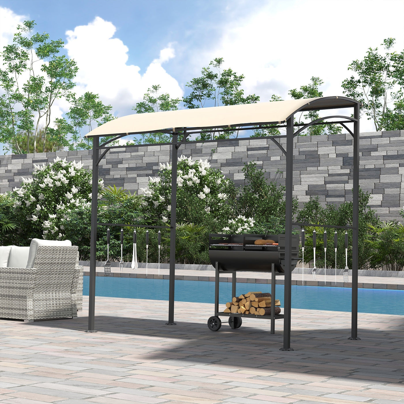 Outsunny 2.2 x 1.5 m BBQ Grill Gazebo Tent, Garden Grill with Metal Frame, Curved Canopy and 10 Hooks, Outdoor Sun Shade, Beige - Beige