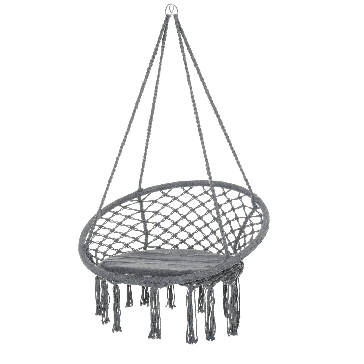 Outsunny Outdoor Cotton-Polyester Blend Macrame Hanging Rope Chair with Cushion, Portable Garden Chair with Fringe Tassels for Patio, Deck, Tree, Grey - Grey