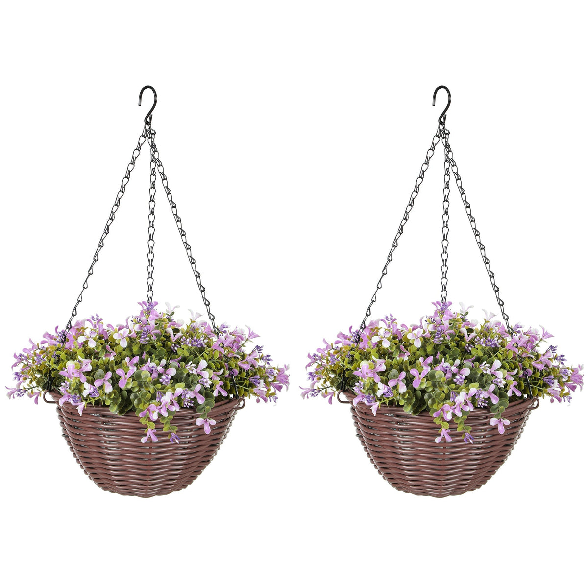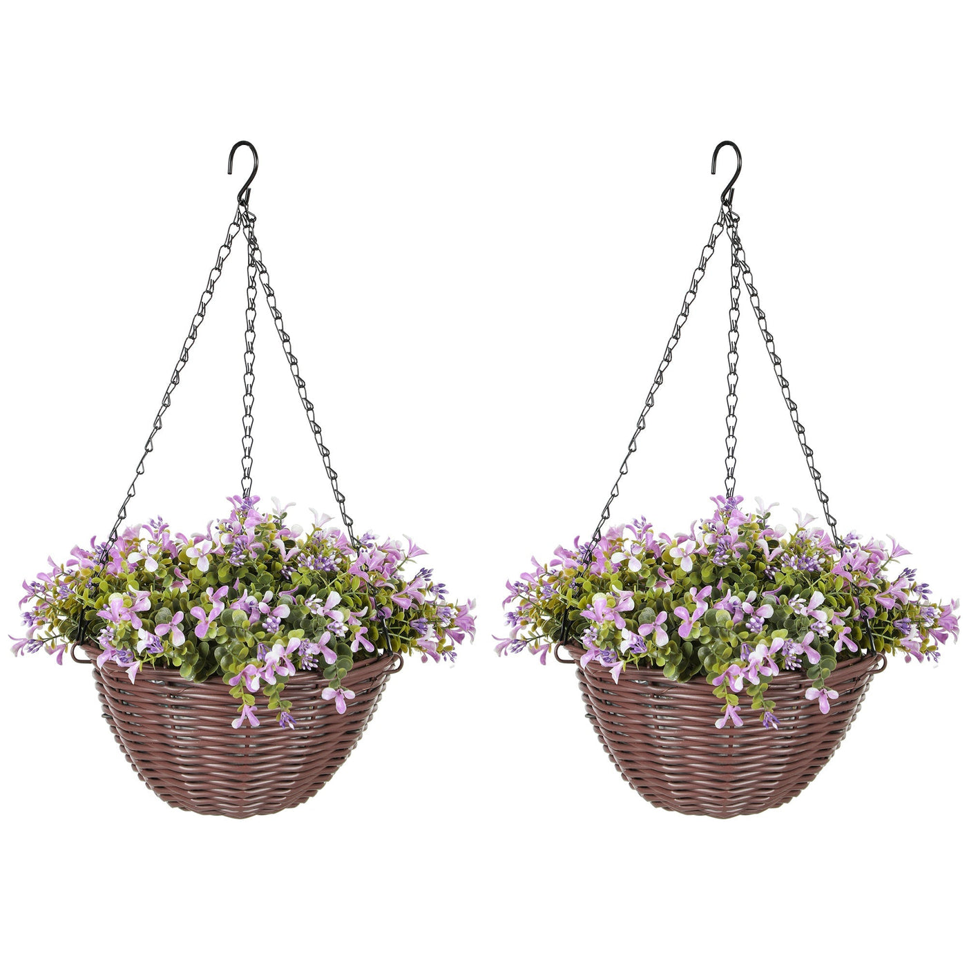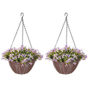 HOMCOM Artificial Flowers in Basket Set of 2, Artificial Hanging Baskets with 75 Leaves and 15 Flowers in Pot, Decorative Plant for Home Office Decor, Purple - Purple