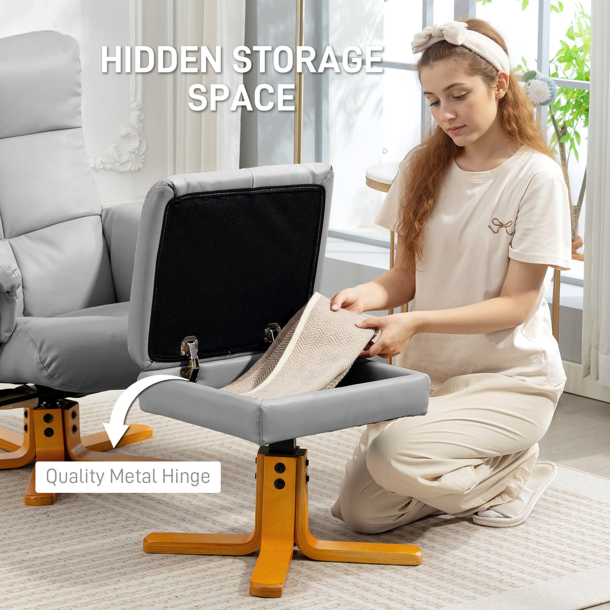 HOMCOM PU Leather Swivel Recliner Chair with Footstool, Wooden Base and Storage for Living Room, Light Grey - Light Grey