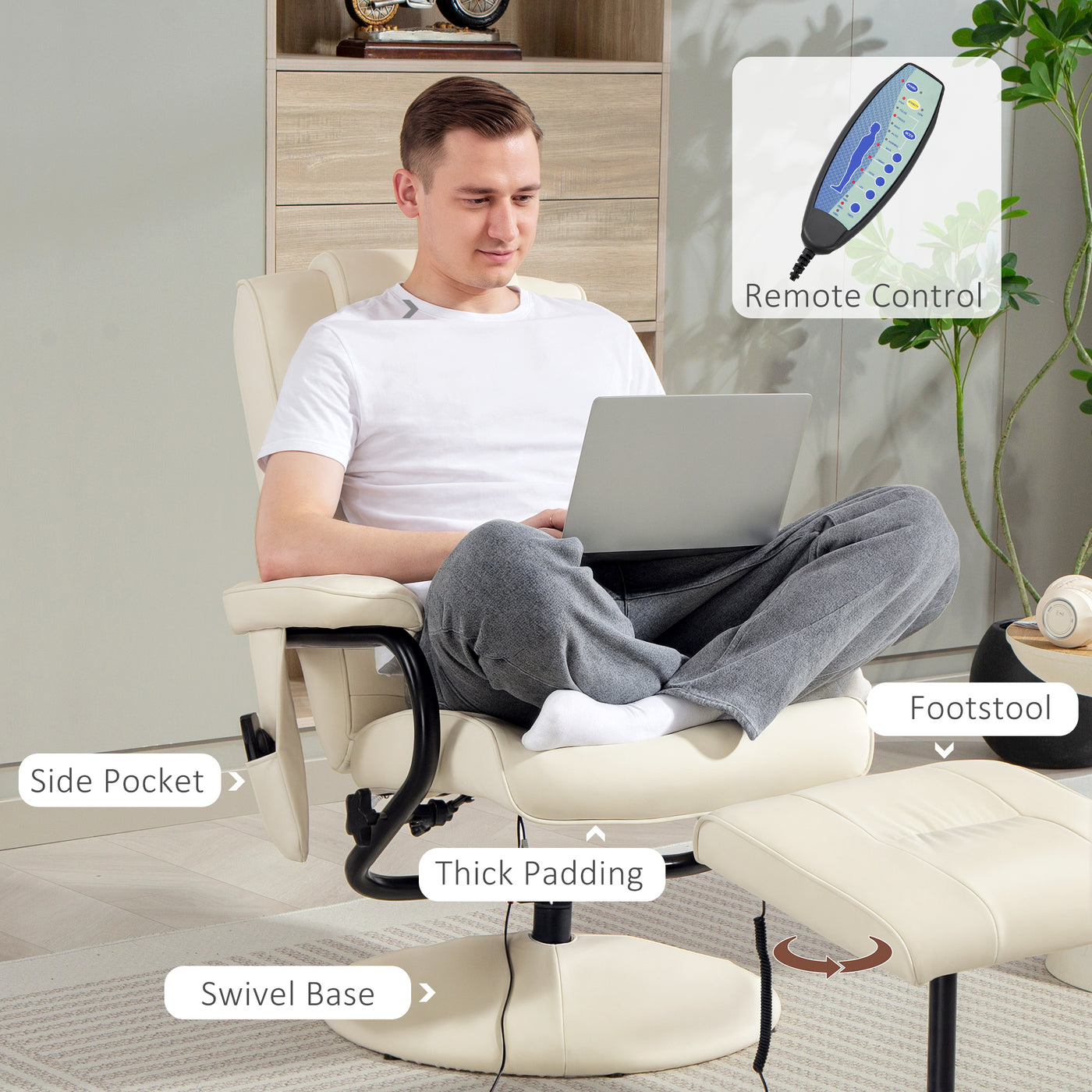 HOMCOM Swivel Recliner Chair and Footstool, Faux Leather Massage Recliner Armchair with Remote Control and Round Wrapped Base, Cream White - Cream