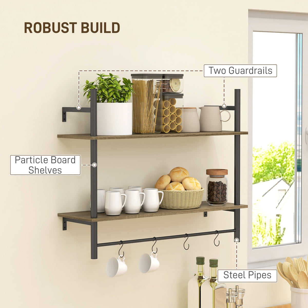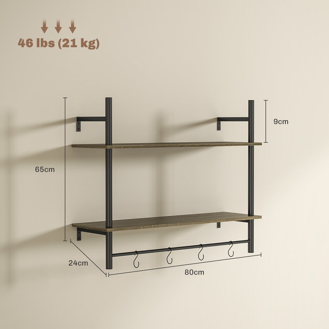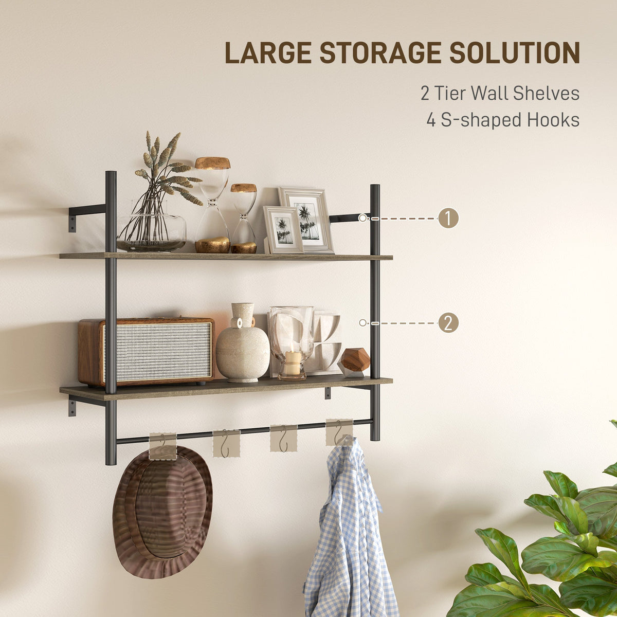 HOMCOM Wall Mounted Floating Shelves with 4 Hooks, Rustic Wall Shelf Unit for Living Room, Entryway, Grey - Grey