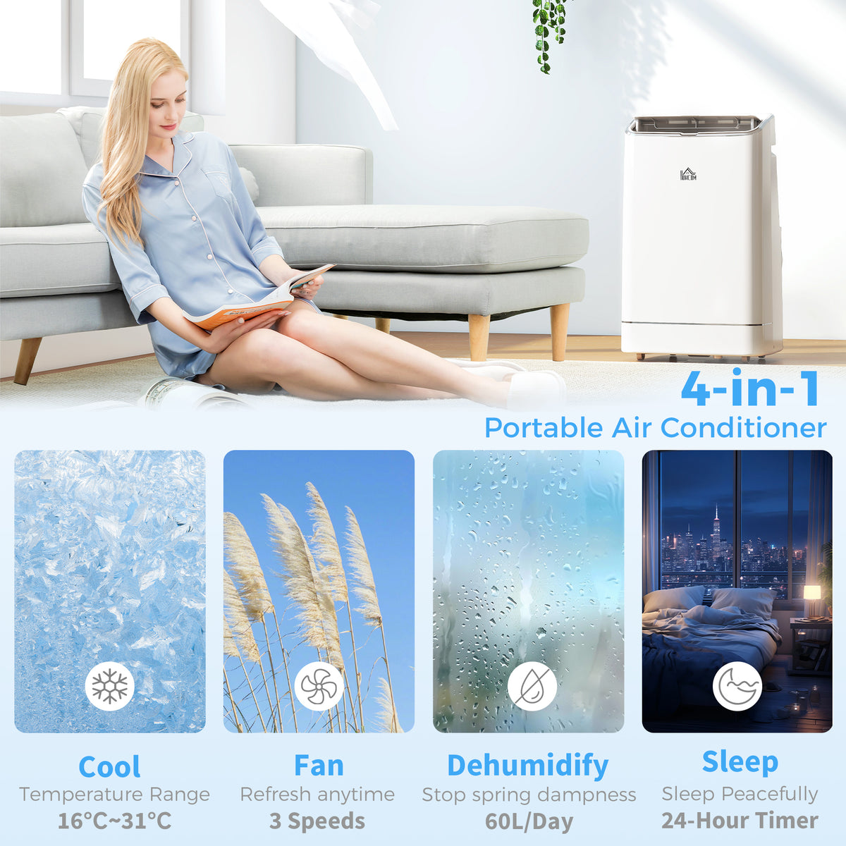 HOMCOM 14000 BTU Mobile Air Conditioner, 35m², Smart Home WiFi, with Dehumidifier, Fan, 24H Timer, Window Kit, White - White